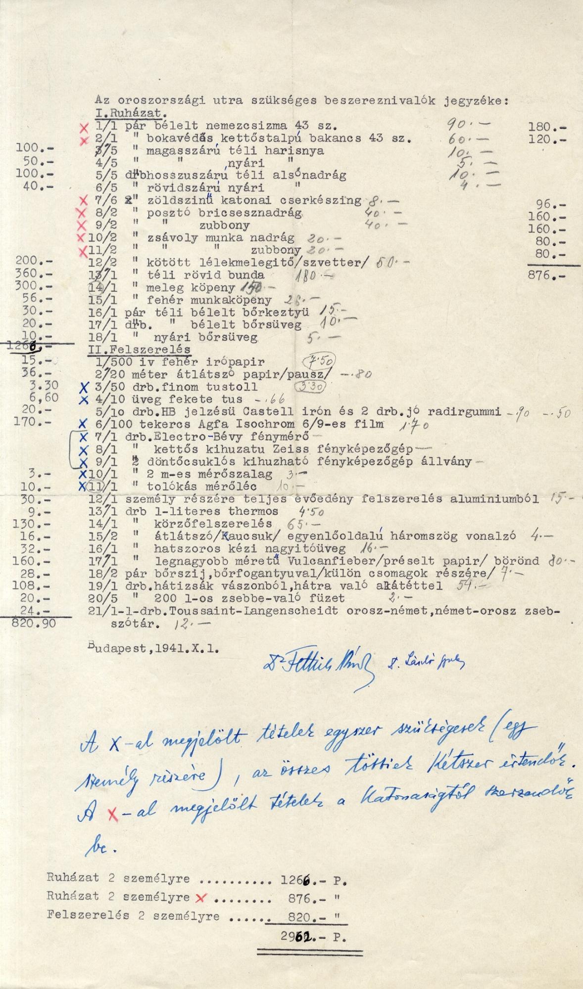 A Fettich Nándor által összeállított, beszerzendő tárgyak listája