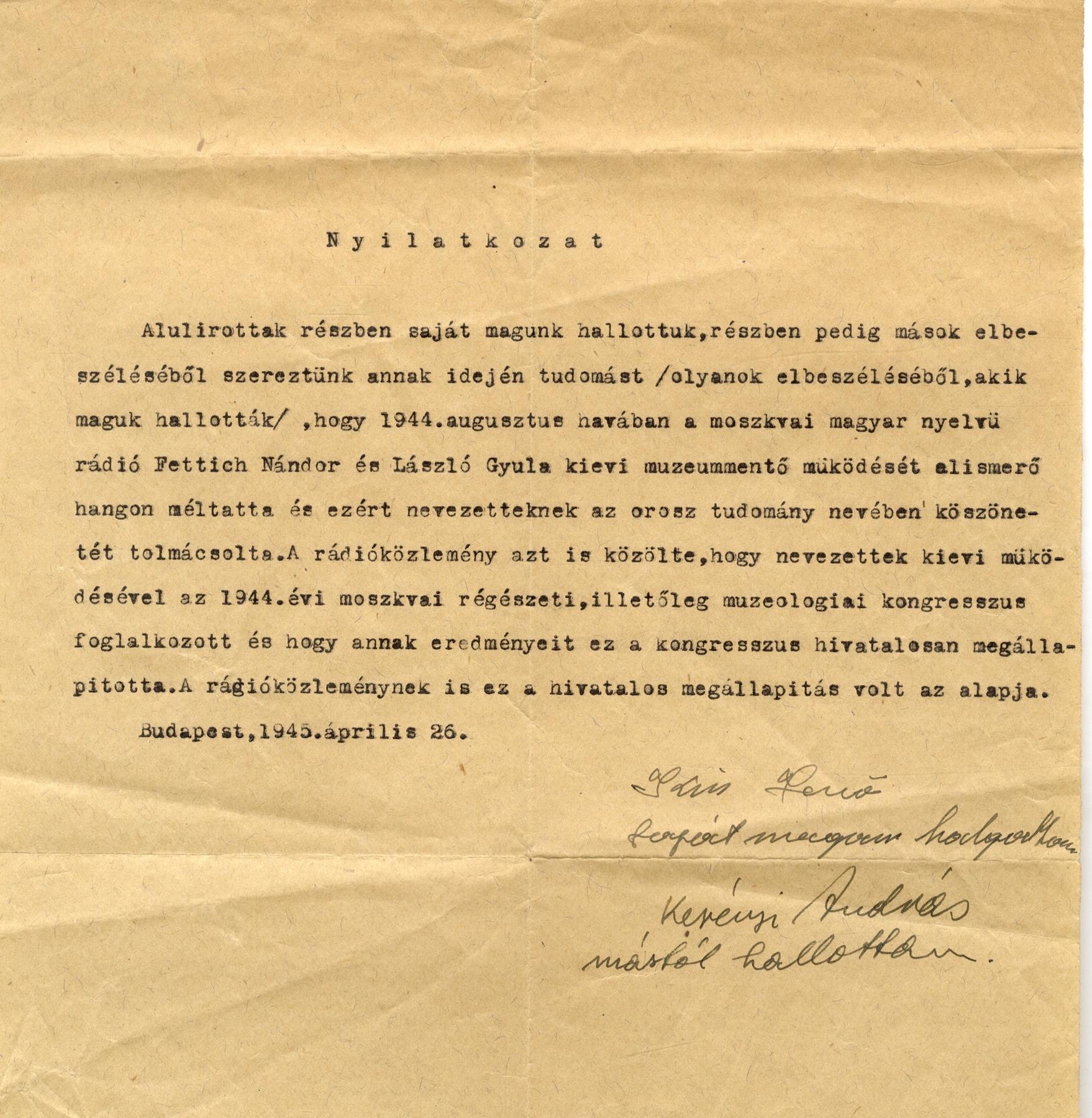 Tanúvallomás 1945-ből a moszkvai Kossuth Rádió köszönetnyilvánításával kapcsolatban