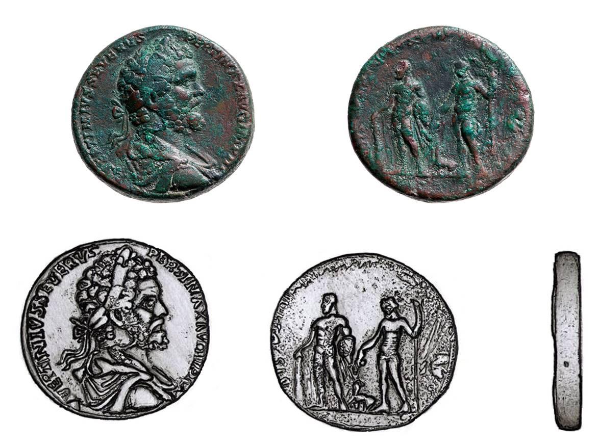Septimius Severus rézötvözet medalionja Dunaújváros (Dunaptenele, Intercisa) környékéről (Fotó: Gedai Csaba, rajz: Szabadváry Tamás)