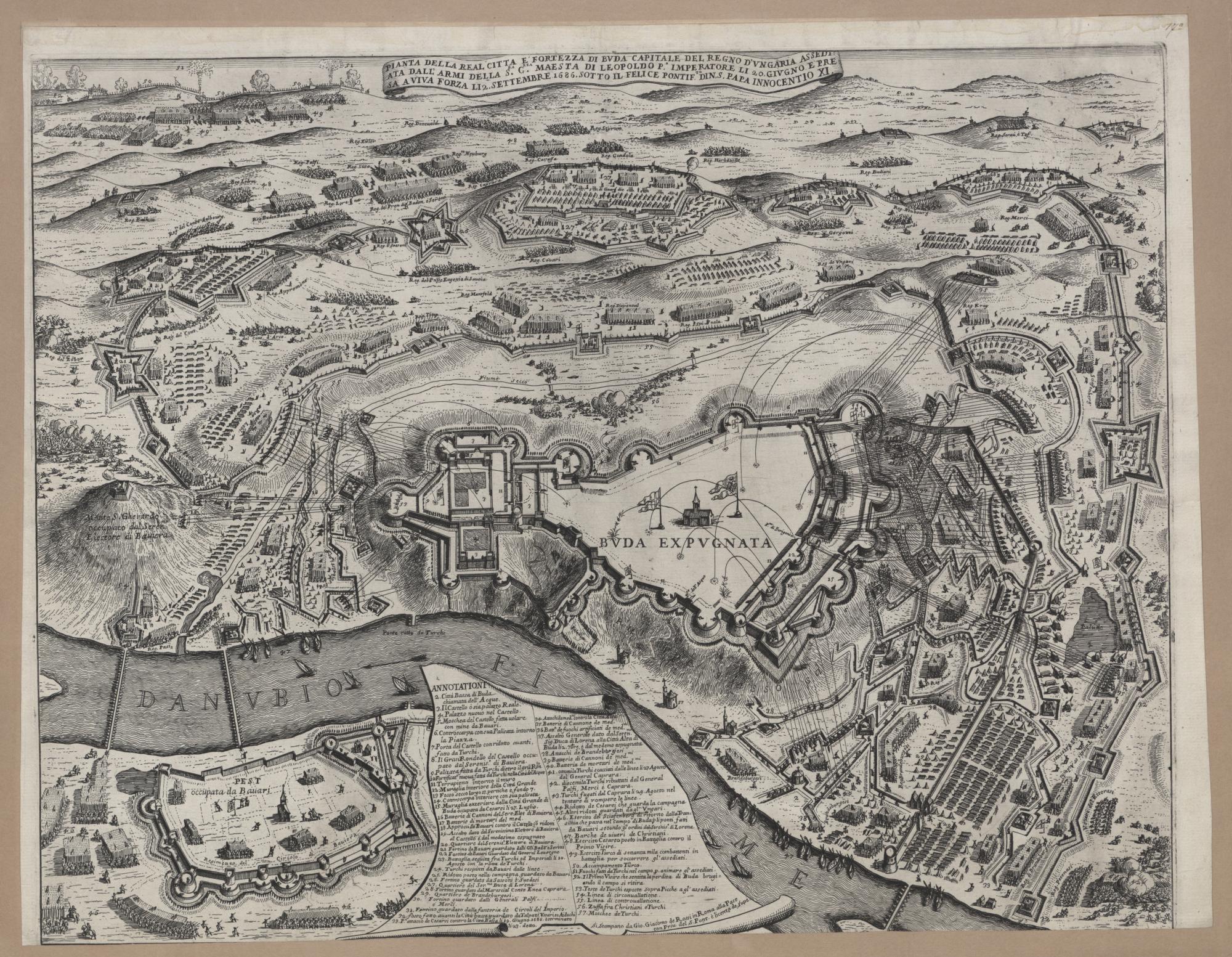 Ismeretlen olasz mester: Buda visszafoglalása, 1686. Részletesen bemutatja az ostromlók táborának védműveit, a circumvallatiót, és a várfalak megközelítéséhez ásott árkokból és redutokból álló contravallatiót.