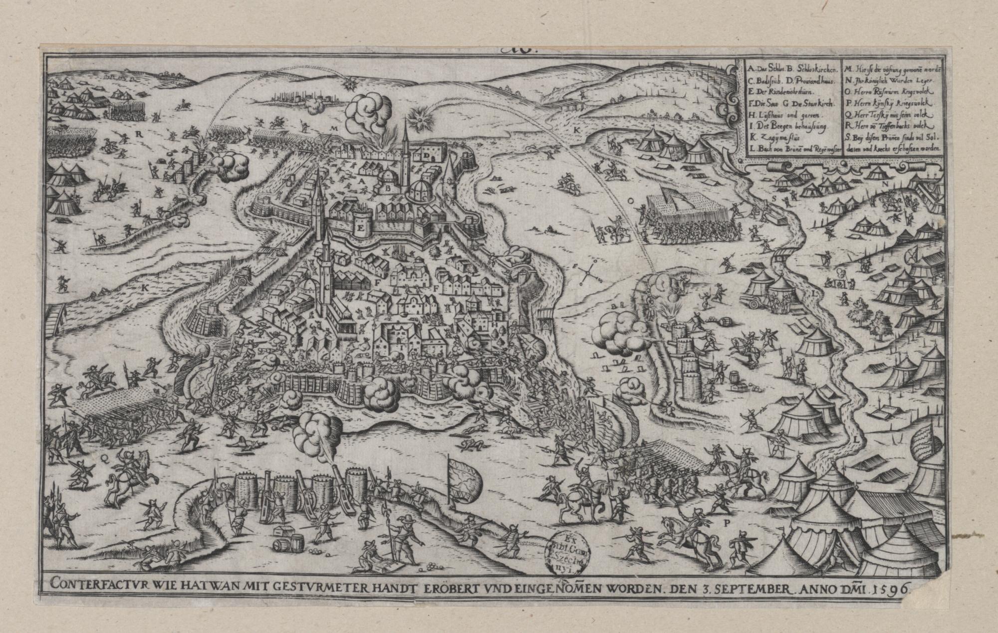 Hans Sibmacher: Hatvan ostroma, 1596. A feltöltött vizesárkon át rohamozzák meg az ágyúk törte réseket.