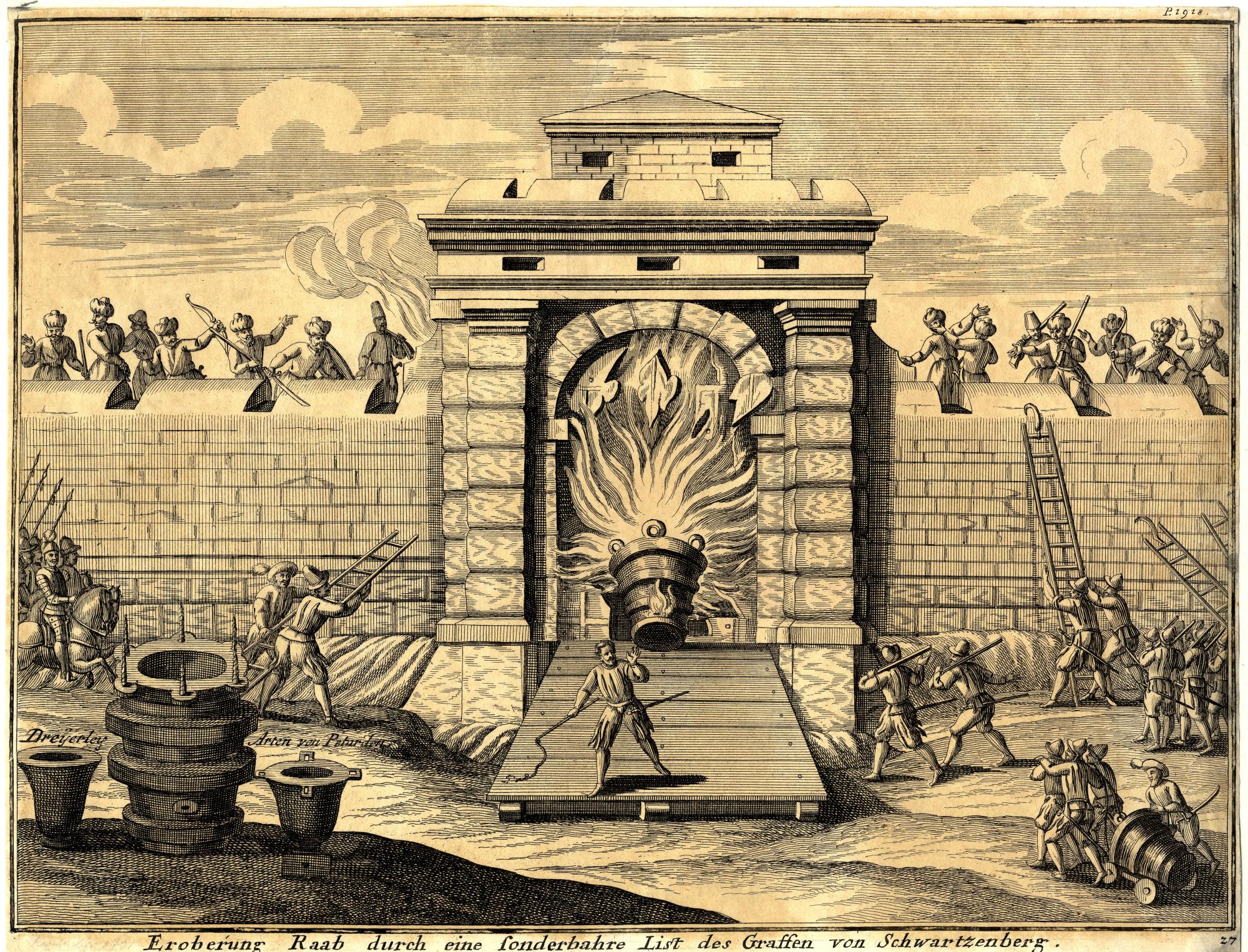 Ismeretlen német mester: Győr ostroma, 1598. A vár kapuját petárdával robbantották be.