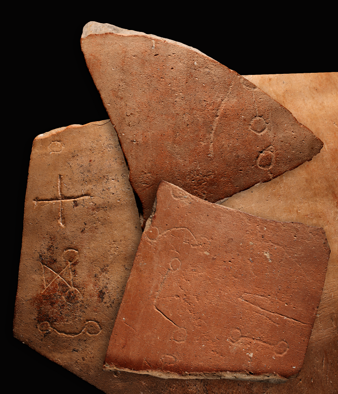 Fényezett felületére gyakorlott kézzel karcolták rá a glagolita írás obla (kerekített) változatának négy írásjelét. A leletek feldolgozása során további két hasonló töredéket találtunk.