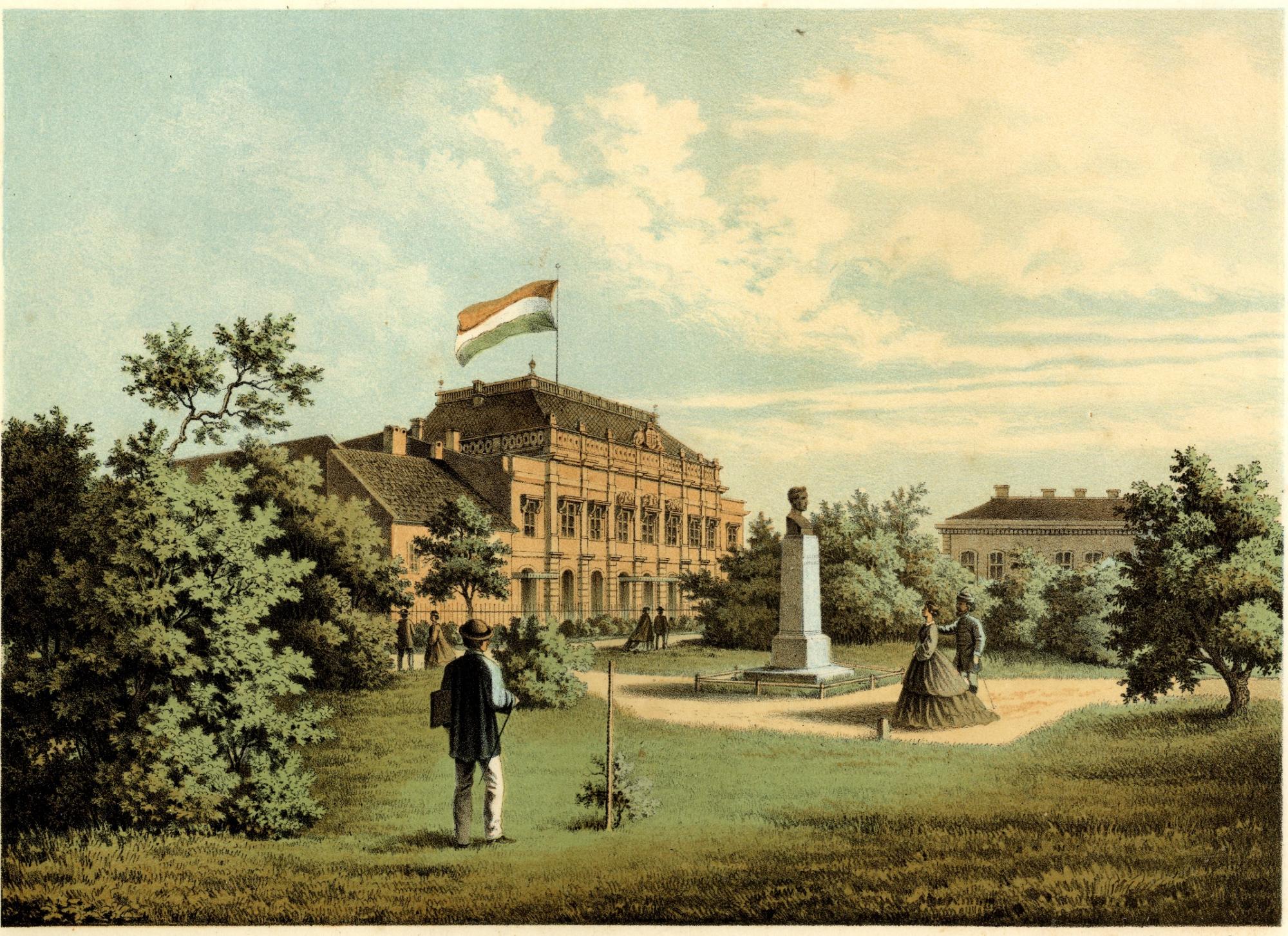 A Múzeumkert első padjait is ennek a találkozásnak köszönhetjük? (A Múzeumkert 1865-ben, Slowikowski Ádám vízfestményén, MNM Történelmi Képcsarnok)
