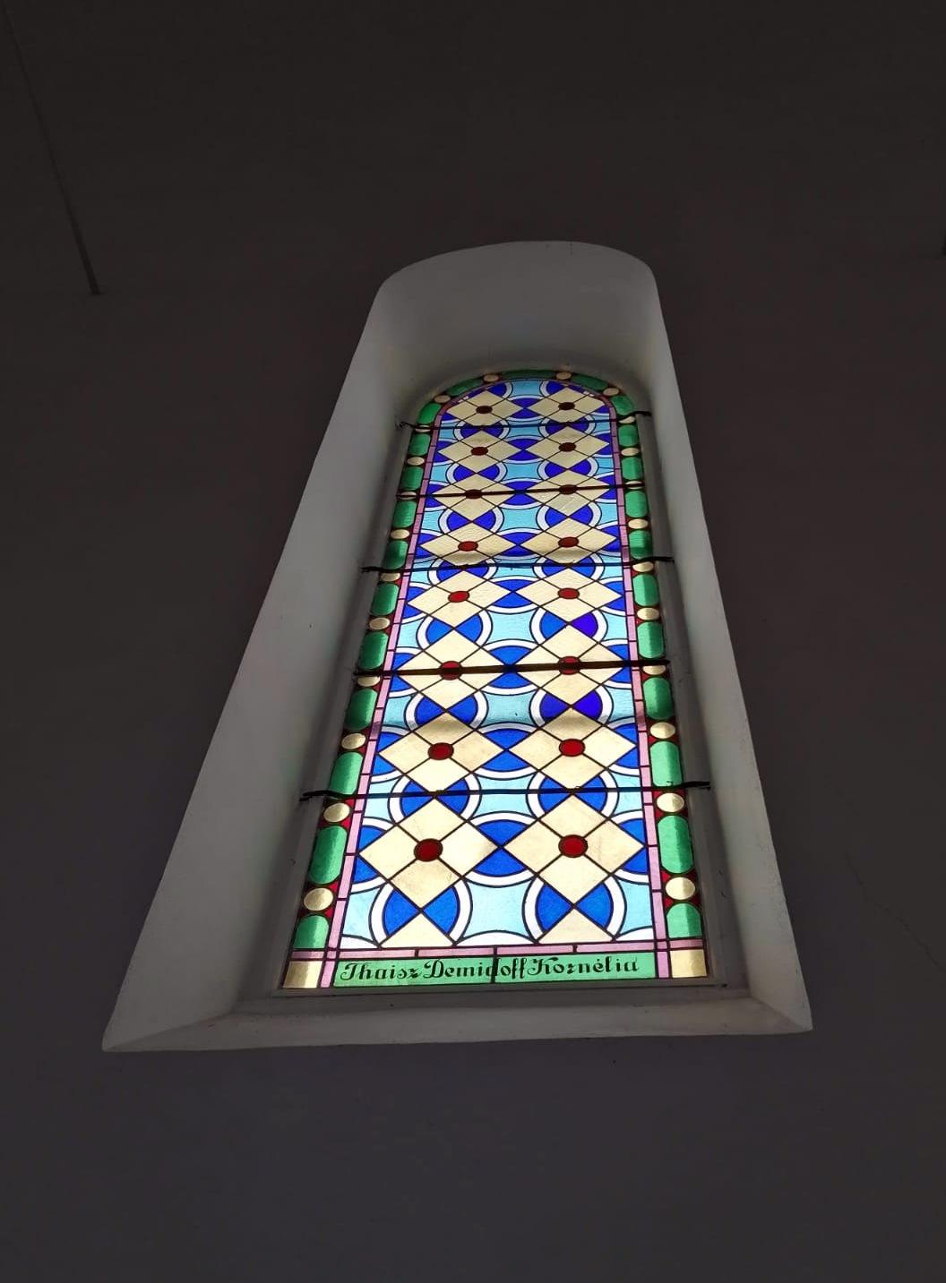 Thaisz Péterné Demidoff Kornélia nevét viselő színes üvegablak a nagybányai evangélikus templomban (az ablak már Kornélia halála után készült, ezzel is emléket állított neki a férje)