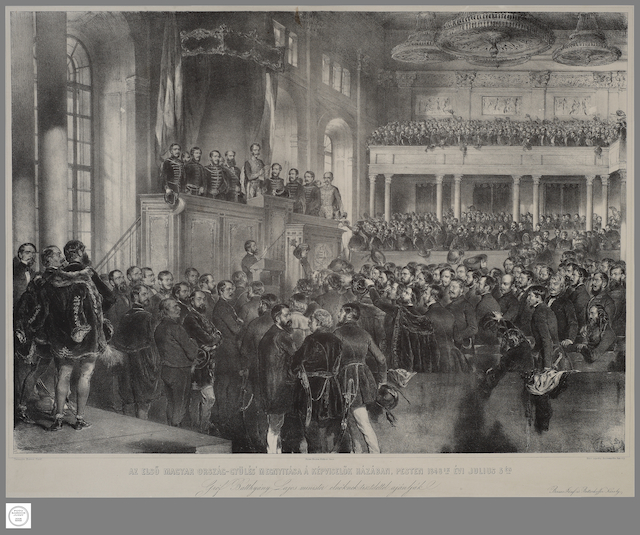 Borsos József – August von Pettenkofen: Az első magyar népképviseleti országgyűlés megnyitása Pesten, 1848. július 5-én1848, papír, litográfia; 62,6 x 73 cm, Magyar Nemzeti Múzeum, Történelmi Képcsarnok ltsz.: 55.753.