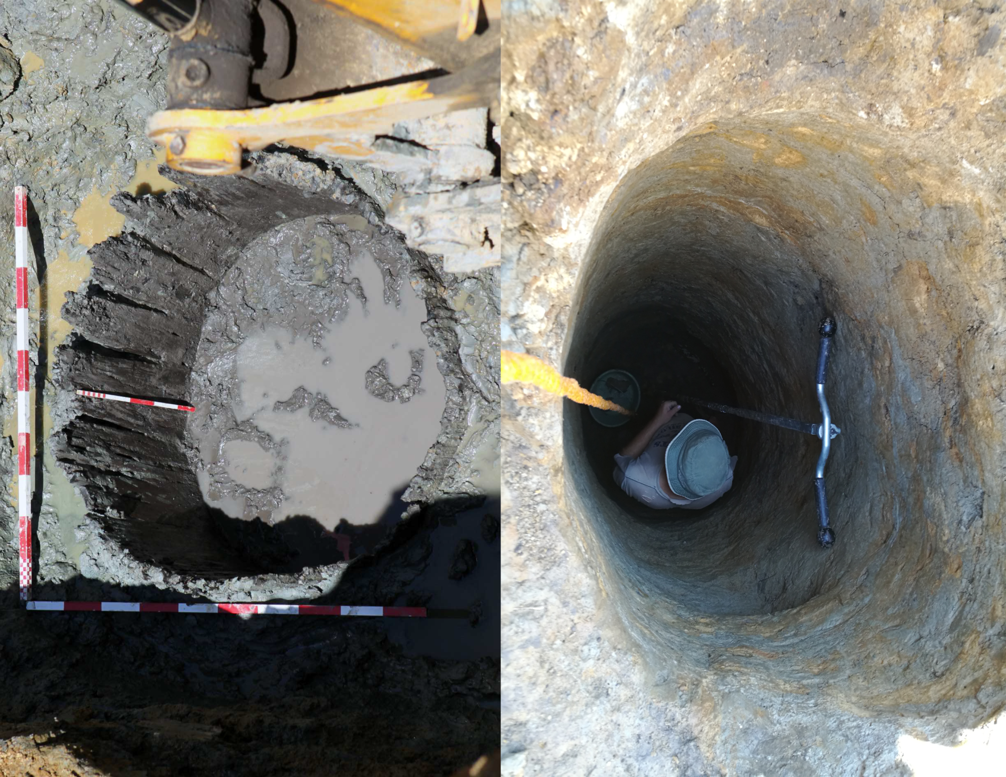 Újkőkori kutak az Alföldön: középső neolitikus bodonkút (kivájt fatörzzsel kibélelt kút) (Berettyóújfalu-Somota 2. lelőhely) és késő neolitikus kopolyakút (béleletlen, sekély víznyerő) feltárás közben (Öcsöd-Kováshalom)