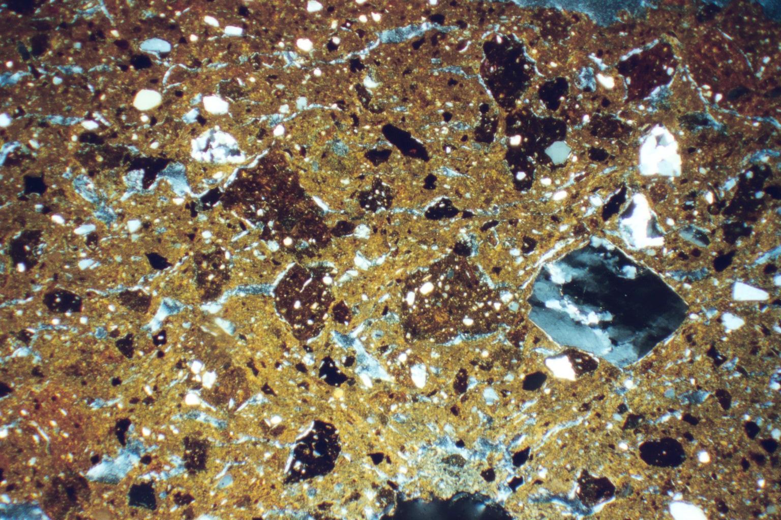 Tört kerámia soványítás (barna, sötétbarna, feketés szemcsék) bronzkori kerámiában Százhalombatta, Földvárról (11473). Ltsz. 97.117.126, látható terület 6,8 mm. Fotó: Kreiter Attila