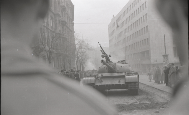 Szovjet csapatok vonulnak a Balassi Bálint utcán a Parlament felől a Jászai Mari térnél. Budapest, 1956. október 30-31. Muzsnay Géza felvétele (MNM – Történeti Fényképtár)