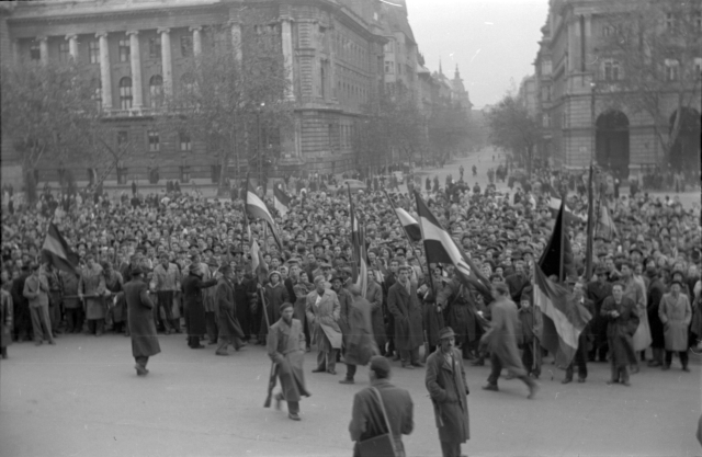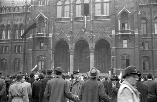 Tömeg a Parlament előtt. Budapest, 1956. október 31. Muzsnay Géza felvétele (MNM – Történeti Fényképtár). Nagy Imre ezen a napon kora délután beszédet mondott a Kossuth Lajos téren. Bejelentette, hogy a kormány tárgyalásokat kezdett Magyarországnak a Varsói Szerződésből való kilépéséről és a szovjet csapatok kivonulásáról. Október 23-át nemzeti ünneppé nyilvánította.