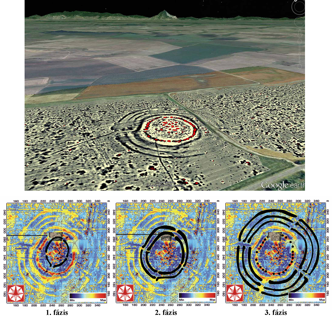 A késő újkőkori halmot (tellt) a település többi részétől elválasztó többszörös árokrendszer. Polgár-Csőszhalom (forrás: Mesterházy et al. 2019)