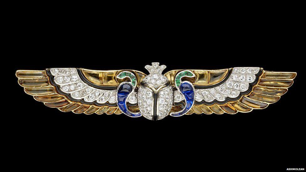 Cartier gyémánt bross szárnyas skarabeussal és kobrákkal, 1923
