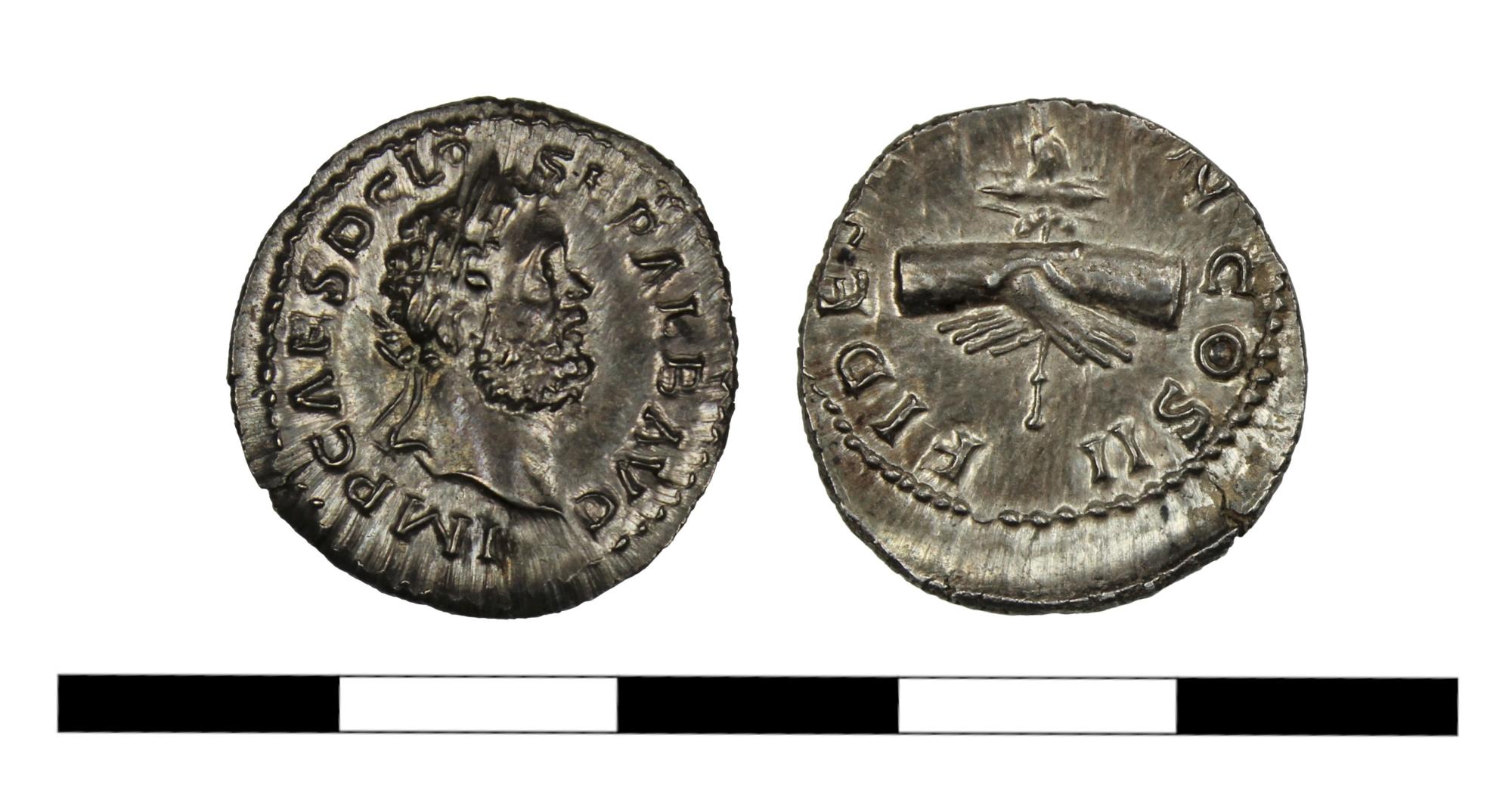 A hátlap szintén a konfliktusra utal: két, összekulcsolódó jobb kezet látunk, ill. a római legiók sast formáló hadijelvényét. Hogy az utóbbi elem a háborúra utal, aligha kérdéses – de a római pénzek (és az azokon tükröződő császári propaganda) esetében a kézfogás motívuma is a hadsereghez, a (polgár)háborúkhoz kötődik. A kézfogás ugyanis az egyetértés, az összetartás (latinul: concordia) szimbóluma, melyet elsősorban a katonai csapatok egyetértésével kapcsolatban propagáltak, a különböző csapatok közti összhang fontosságát, a viszályok, polgárháborúk megelőzésének (és mielőbbi lezárásának) igényét hirdetve. Ezt erősíti a hátlapi körirat is, mely azonban jelen érménél csak részlegesen olvasható. A darab ugyanis gyártási hibás. A római érméket kézi erővel, a verőtöveket kalapáccsal ütve készítették, itt azonban a két verőtő (amelyek az érme előlapi és hátlapi képét adják) elmozdult egymáshoz képest, így a hátlap elcsúszott: a körirat egy része lemaradt az érméről. Így csupán az analógiák alapján tudjuk, hogy e példányon is a FIDES LEGION COS II körirat részleteit olvashatjuk. A fides legionum kifejezés a csapatok hűségére utal, így szintén a háborúhoz kapcsolódik. A consul iterum pedig azt hirdeti, hogy Clodius Albinus ekkor már kétszer is betöltötte a consuli méltóságot.