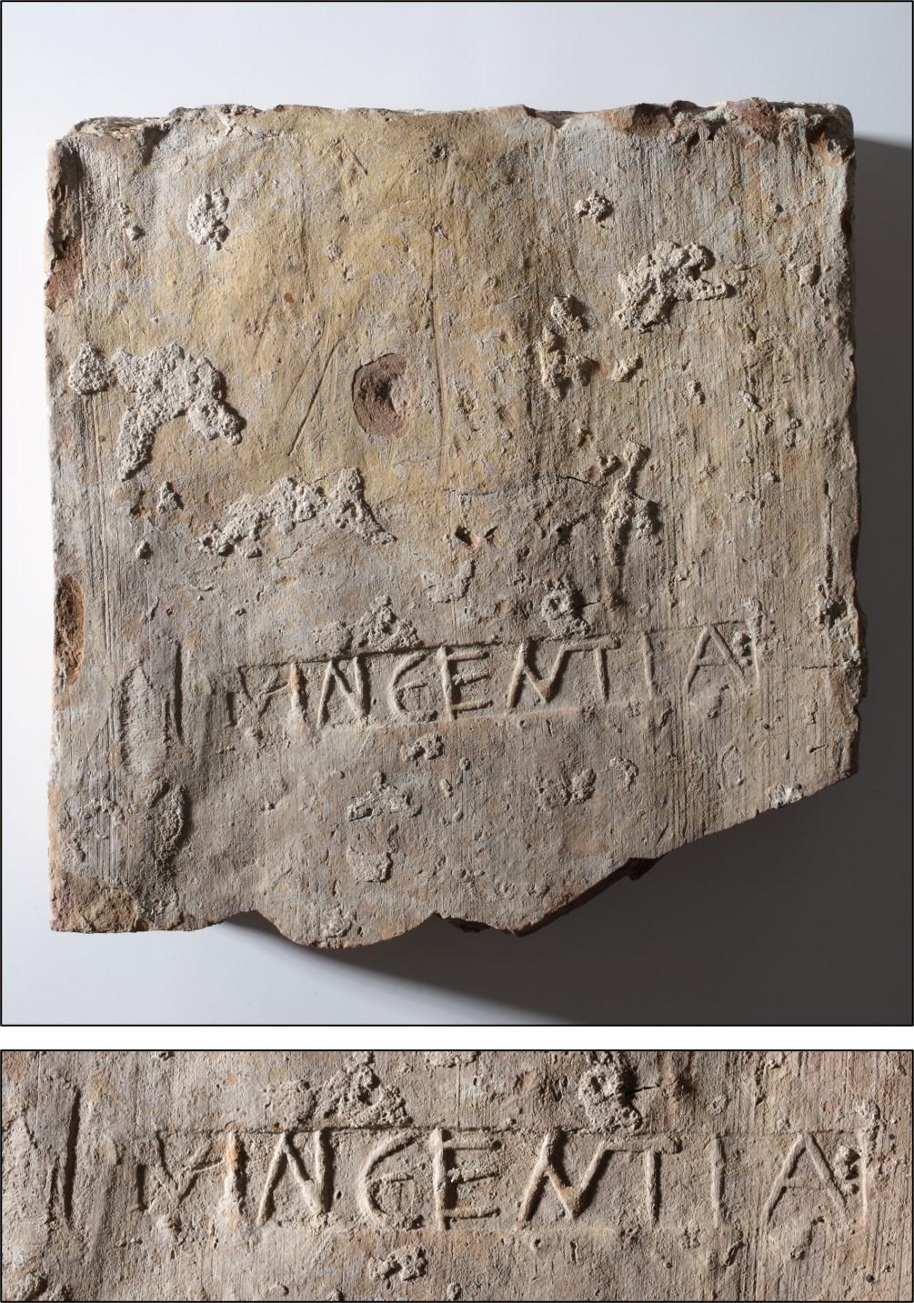 Bélyeges tégla, „VINCENTIA” bélyeggel, lelőhely: contra Aquincum, 1812 (restaurátor: Dúzs Krisztina; fotó: Rosta József)