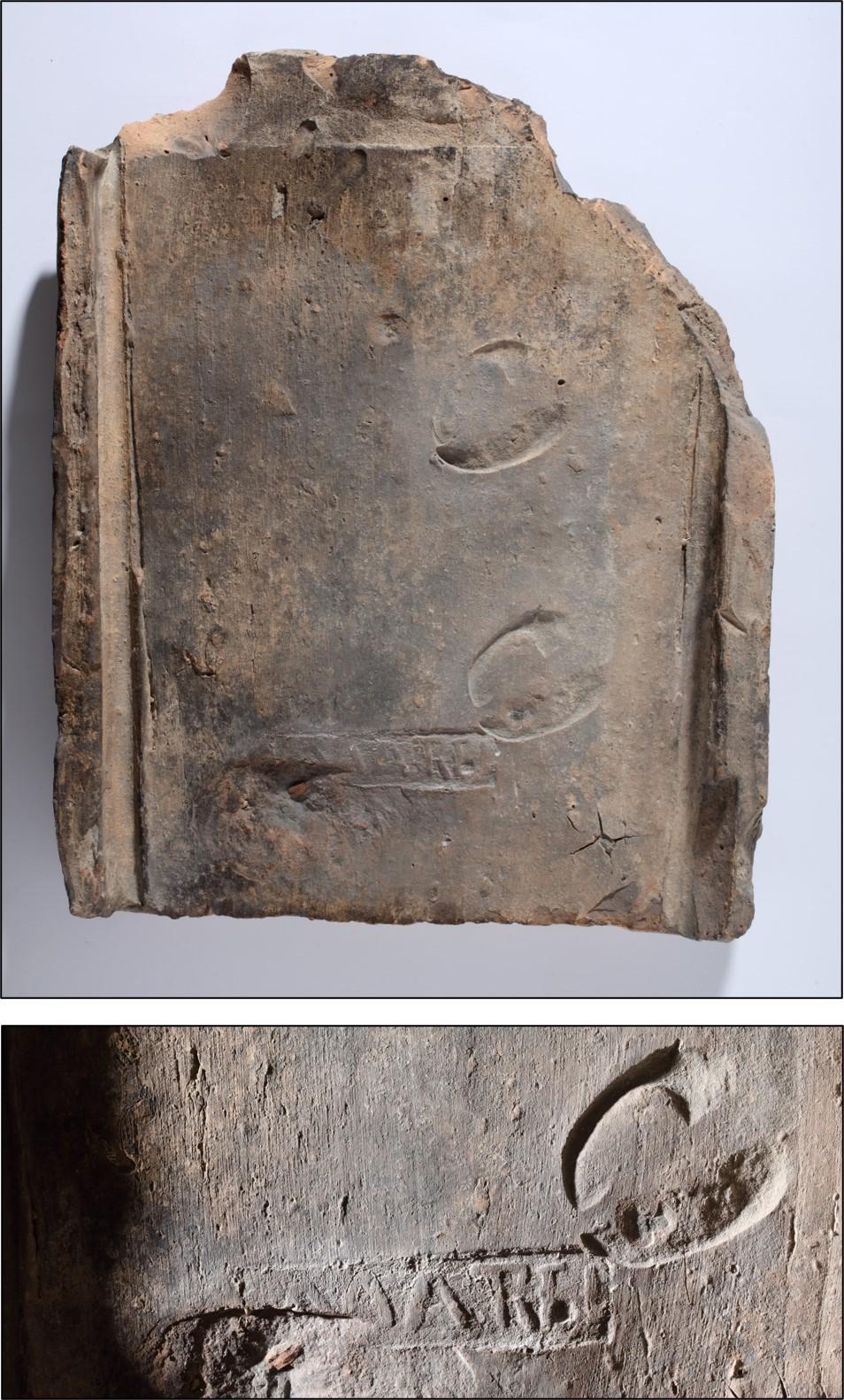 Bélyeges párkányos tégla (tegula) „MARTEL” bélyeggel és fiatal szarvasmarha lábnyommal, lelőhely: contra Aquincum, 1848 (restaurátor: Dúzs Krisztina; fotó: Rosta József)