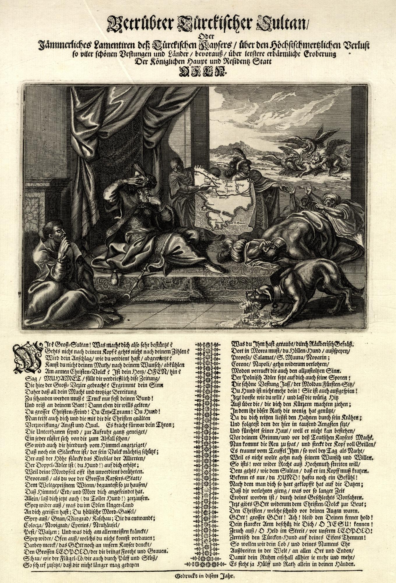 A német nyelvű verses magyarázattal kísért metszeten a baldachinos trónon ülő IV. Mehmed szultán látható, amint egy szolga egy térképen az elvesztett Budára mutat, mire a szultán kétségbeesésében kiejti kezéből a jogart. Jobbra a »török véreb« szájából az elnyelt városok: Buda, Esztergom és Érsekújvár esnek ki.