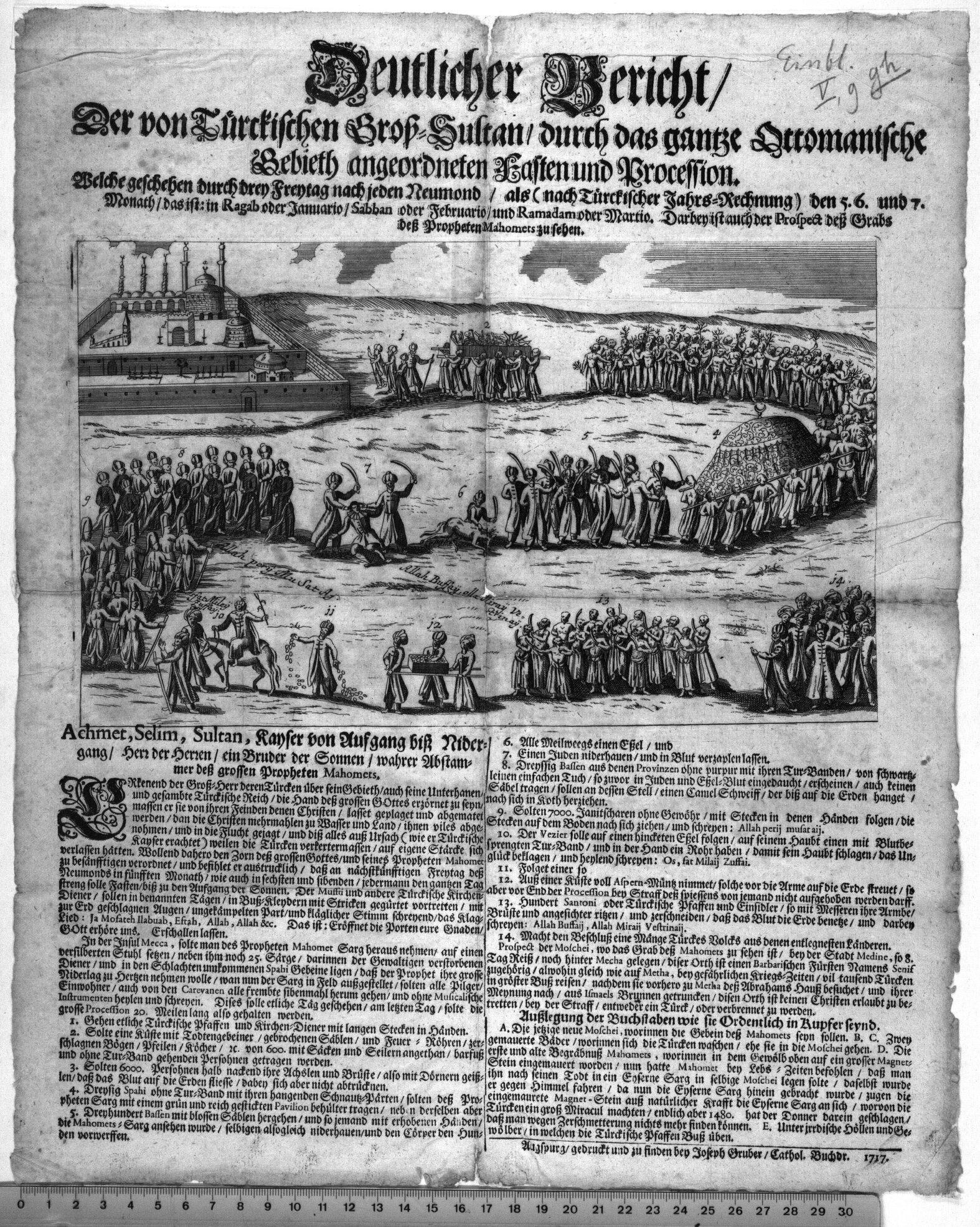 A törökök vezeklő körmenete Medinában. Röplap, 1686. München, Bayerische Staatsbibliothek, Einbl. V,9 gh