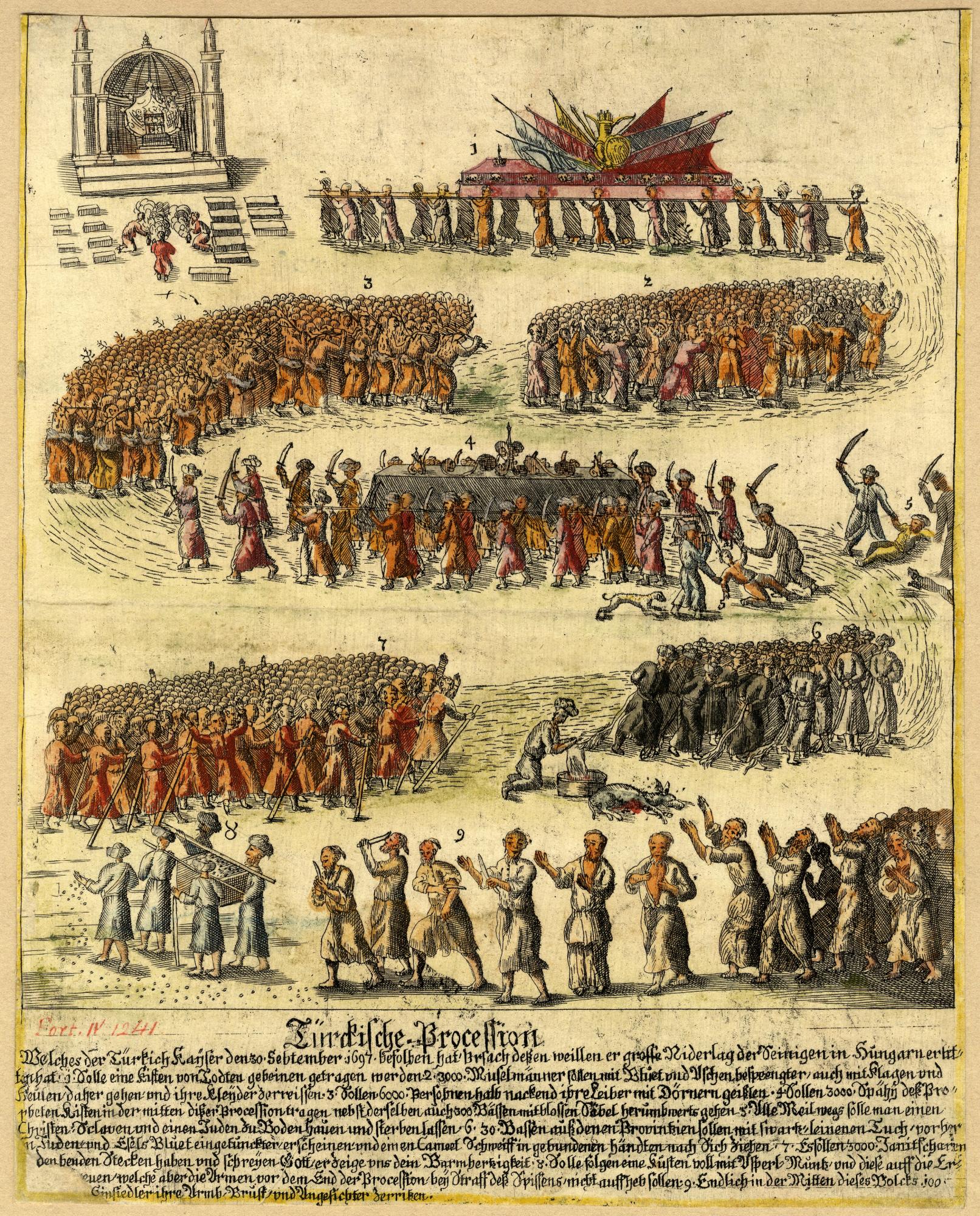 A lapon balra fenn egy mecset látható, amely előtt három térdelő alak égőáldozatot mutat be. A körmenet elején mezítlábas, fedetlen fejű alakok elesett török katonák csontjait és fegyvereit viszik haditrófeákkal díszített ládában. Utánuk halad a „jajgató, siránkozó muzulmánok” 3000 fős tömege, akik hamuval és vérrel hintik be magukat, s ruháikat tépdesik. A 3. számmal jelölt csoportban 6000 félmeztelen férfi vonul önmagát korbácsolva. Mögöttük 3000 szpáhi (lovas katona) vonul Mohamed próféta koporsójával, valamint 300 pasa kivont szablyával. Az 5. számú csoportban keresztény és zsidó foglyok kivégzésére kerül sor. Utánuk 30 pasa vonul hátrakötözött kézzel, tevefarkat vonszolva; zsákvászon ruhájukat leölt szamár vérébe áztatja az ott térdelő török. Utánuk janicsárok haladnak botokkal, majd pénzérméket a földre szóró férfiak egy csoportja halad, végül magukat késekkel kínzó remeték zárják a menetet.