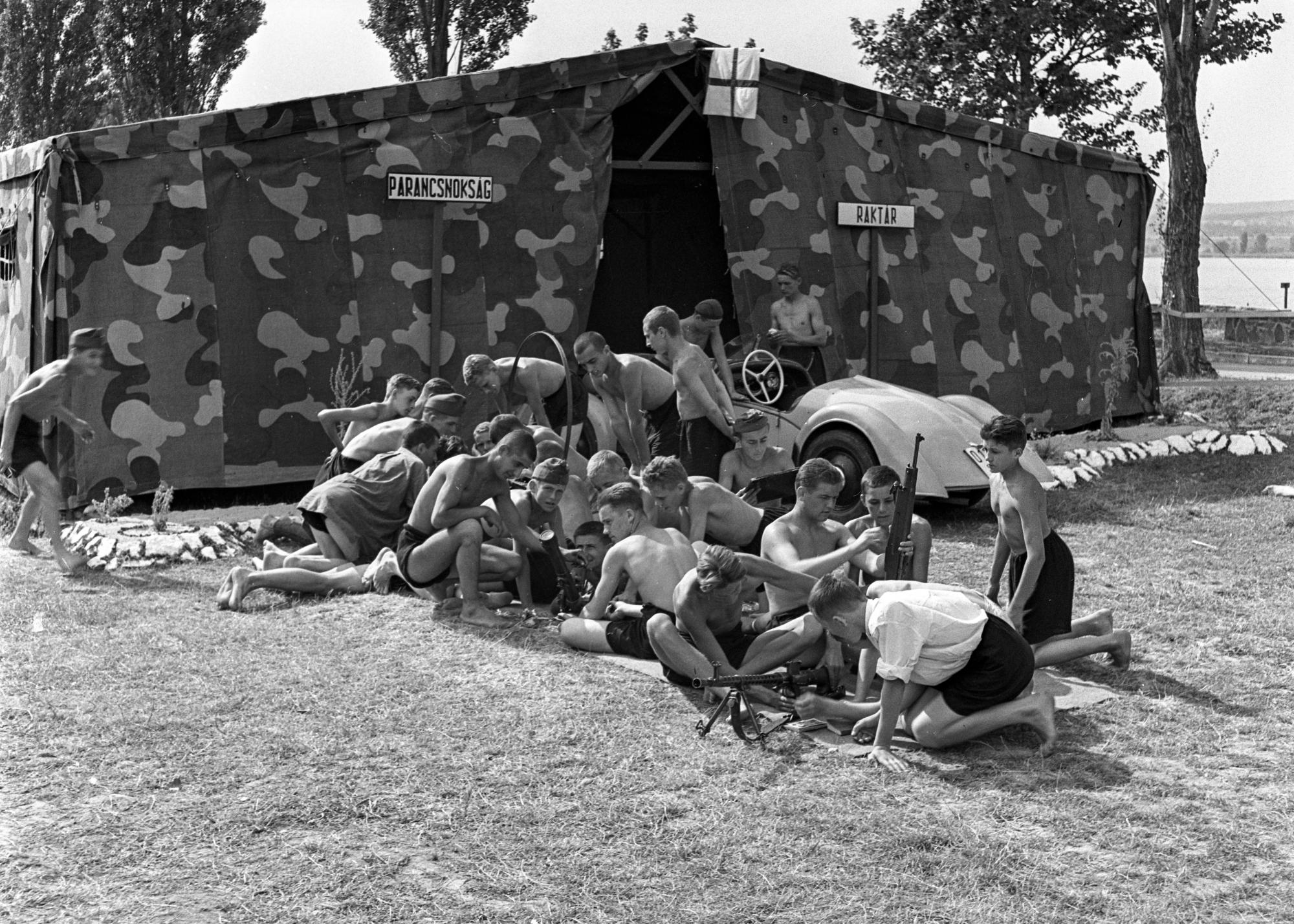 Tihany - Gödrös, 1943: A honvédség központi gépkocsijavító műhelyének tanonctábora. A kép jobb oldalán épp a Király géppisztollyal ismerkednek. Lissák Tivadar/FORTEPAN