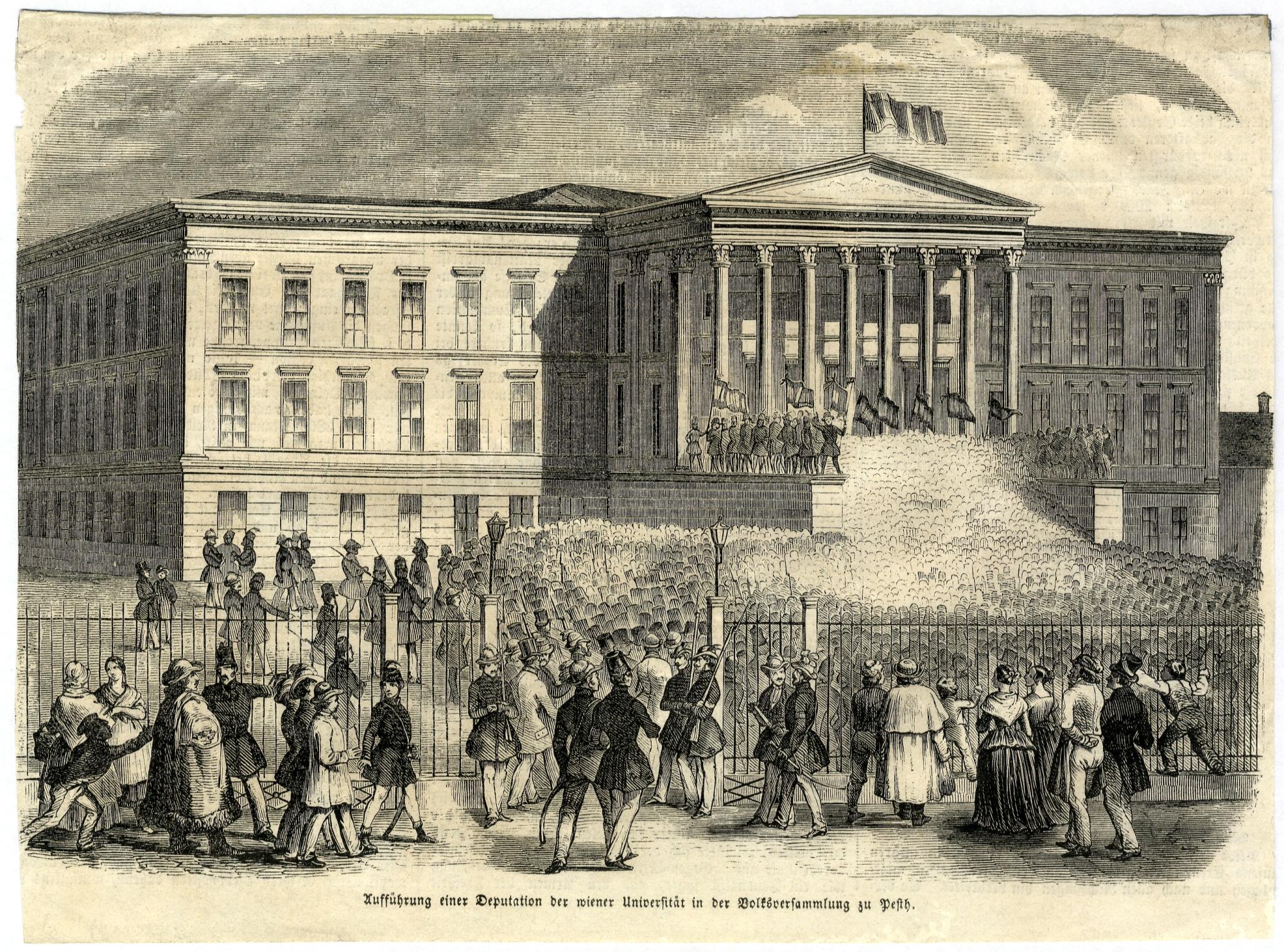 3. kép: A bécsi küldöttséget fogadó népgyűlés a Nemzeti Múzeum előtt (Illustrierte Zeitung. 10. k. 1848. máj. 13. 254. sz. – MNM Történelmi Képcsarnok)
