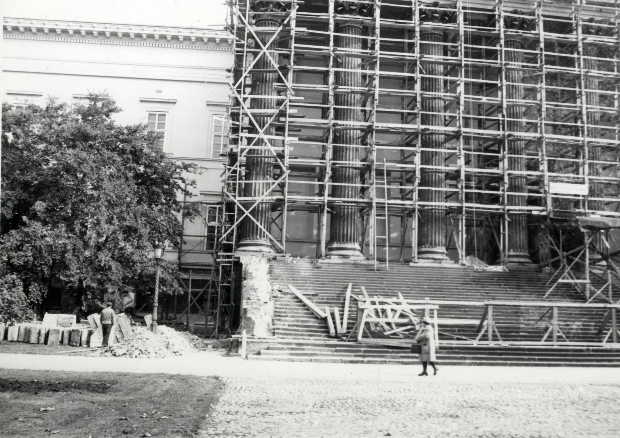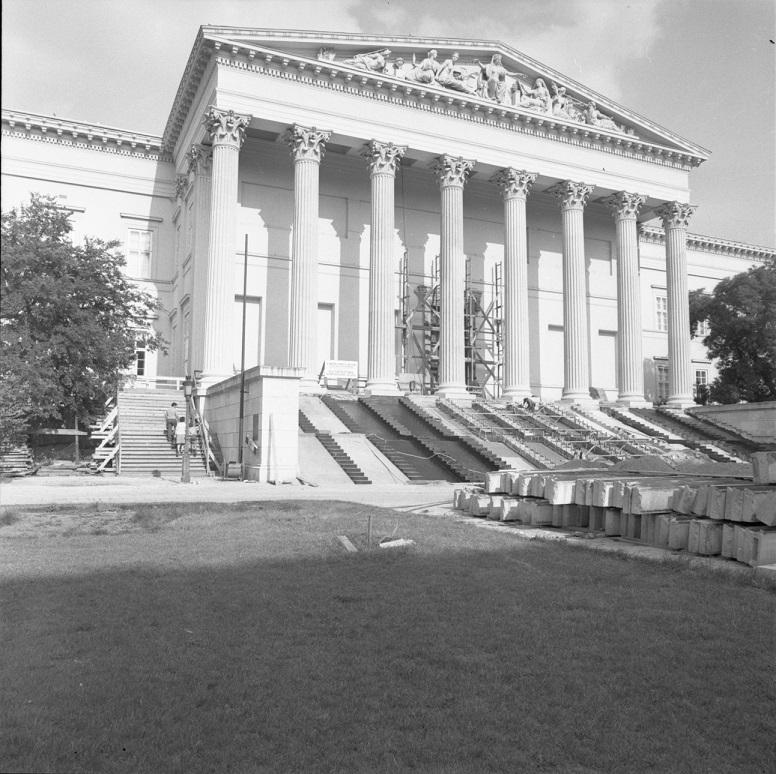 4. kép: A múzeumlépcső baloldali mellvédje teljesen megbontva 1976. Ekkor emelhették ki és helyezhették raktárba a Petőfi-követ (MNM Központi Adattár)