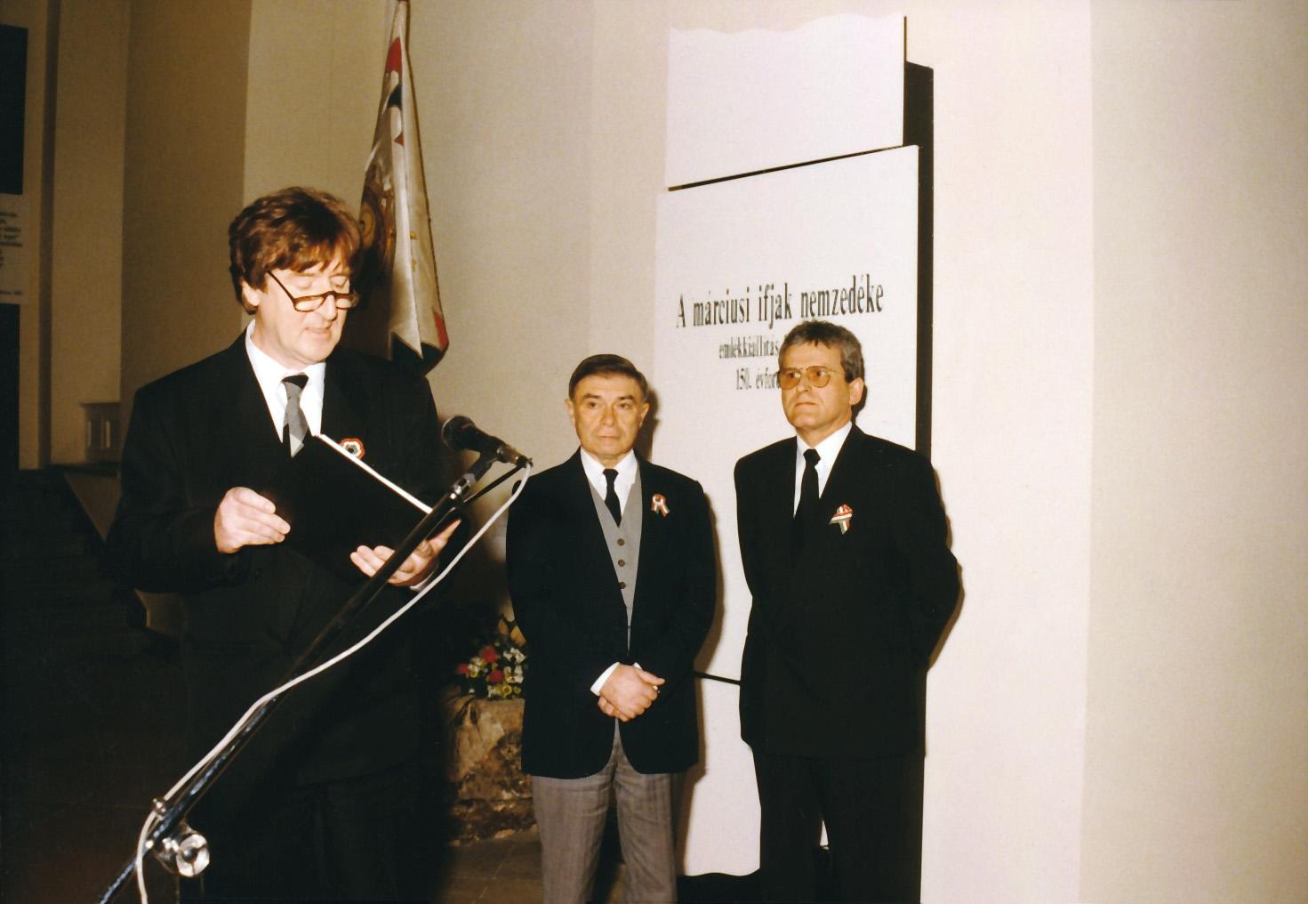 6. kép: A márciusi ifjak nemzedéke c. kiállítás megnyitója, 1998. március 12. Helyey László színművész és Gedai István igazgató között látszik a Petőfi-kő egy kis részlete (MNM Központi Adattár)