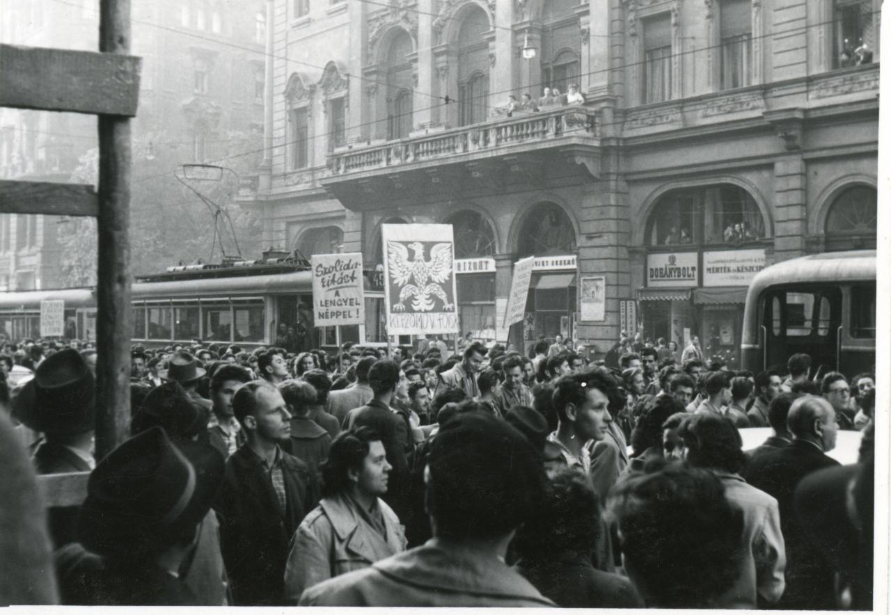 Tüntető tömeg az Kossuth Lajos utcában, az Astoria Szálló előtt. Az egyik transzparensen a „Szolidaritást a lengyel néppel!” felirat olvasható, a másik transzparensen pedig a Lengyel Népköztársaság címerének sas ábrázolása és a „Képzőművészeti Főiskola” felirat látszik. Budapest, 1956. október 23. Heinz Corte felvétele (Magyar Nemzeti Múzeum, Történeti Fényképtár)