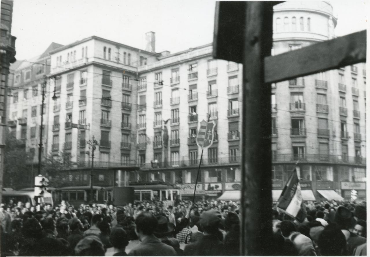 Tüntető tömeg az Kossuth Lajos utcában, az Astoria Szálló előtt. Budapest, 1956. október 23. Heinz Corte felvétele (Magyar Nemzeti Múzeum, Történeti Fényképtár)