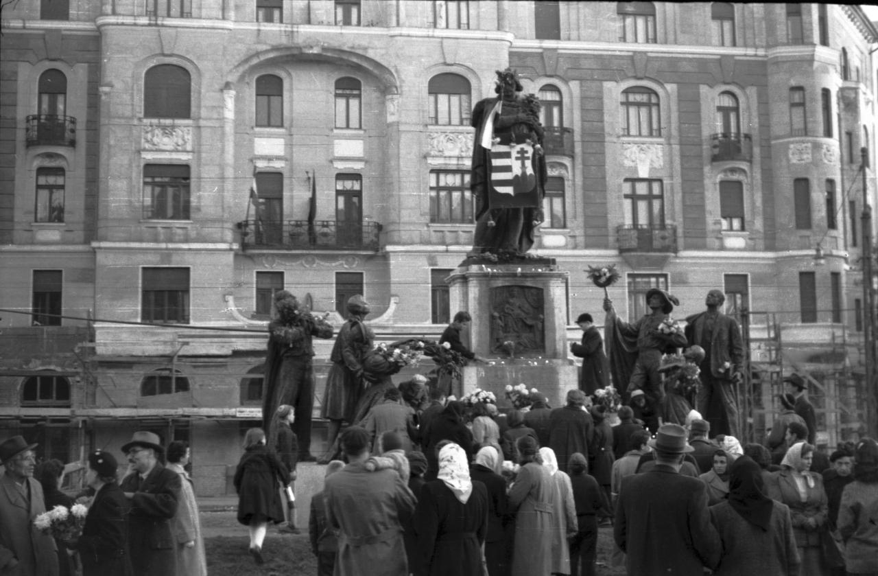 Gyertyagyújtás a Móricz Zsigmond körtéren, a Szent Imre szobornál. Budapest, 1956. november 1. Risztits Miklós felvétele, MNM Történeti Fényképtár