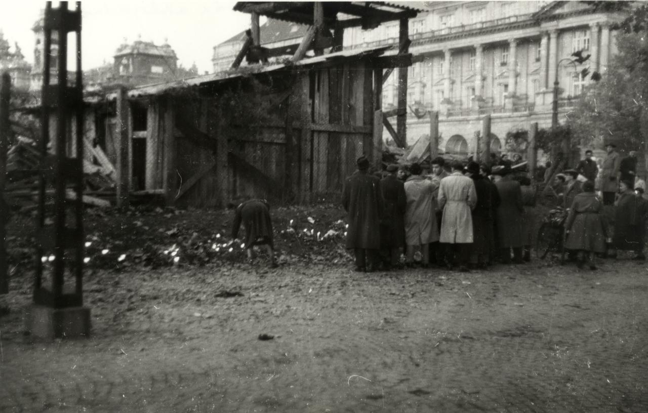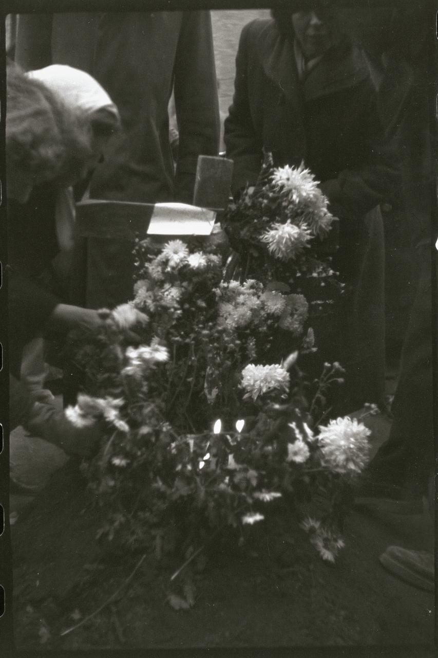 Gyertyák és virágok egy utcai síron. Budapest, 1956. november 1. Juricza Tibor felvétele, MNM Történeti Fényképtár