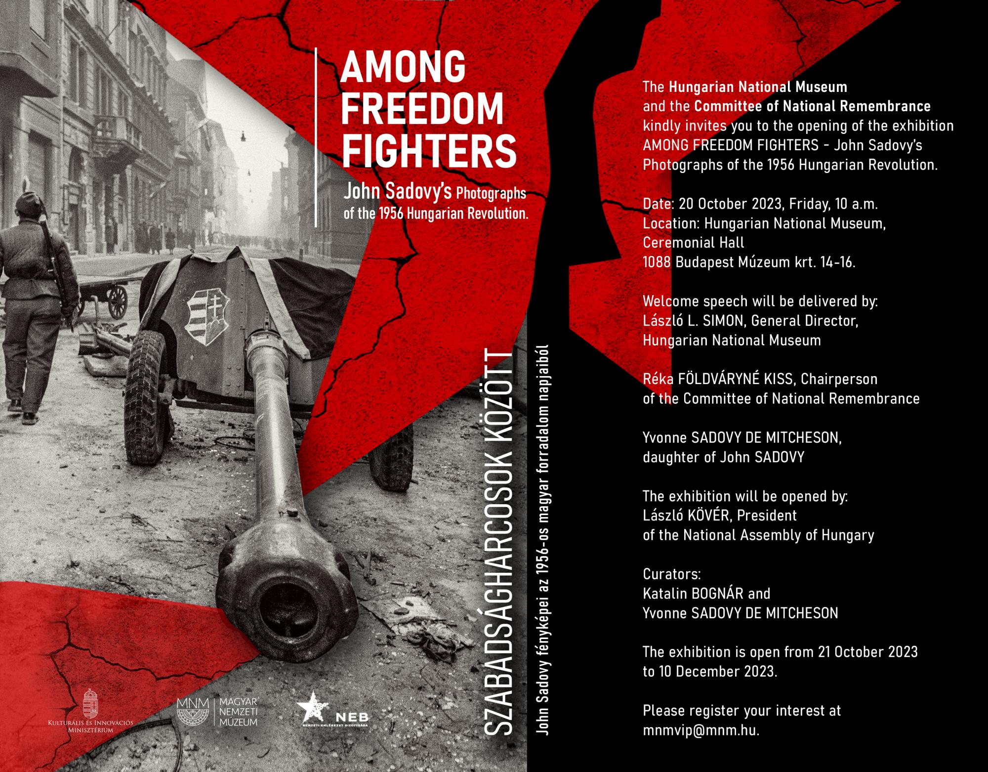 John Sadovy (1925–2010), a Czech-born photojournalist, reporting for the American illustrated weekly Life, witnessed and photographed events of the Hungarian Revolution between 29 October and 1 November 1956. The Hungarian National Museum and the Committee of National Remembrance, Hungary, in collaboration with the photographer’s two daughters, Liza Jane Sadovy and Yvonne Sadovy de Mitcheson, present a selection of John Sadovy’s 1956 photographs in a temporary exhibition. In addition to the photojournalist’s world-famous pictures, a number of unseen images are also displayed which offer a glimpse into the lives of the freedom fighters during ceasefire, and into the world of refugee Hungarians waiting in an Austrian refugee camp.