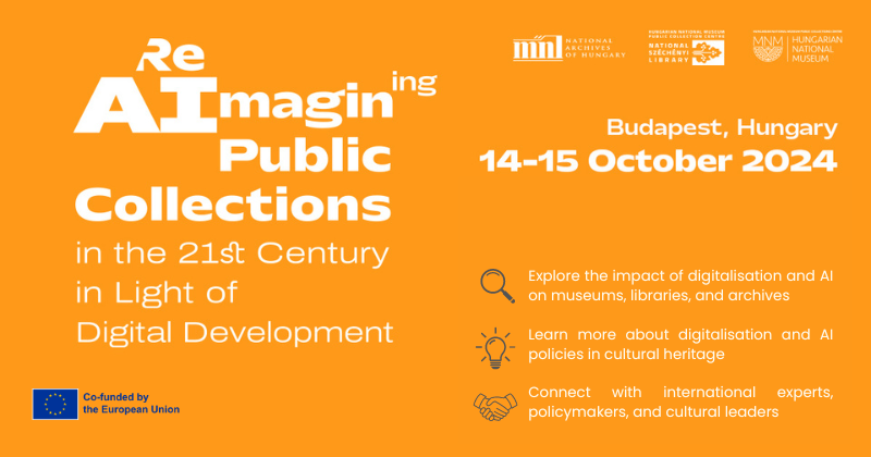The aim of the conference is to explore the impact of digital technological advancements on public collections and to present the opportunities and challenges posed by artificial intelligence and digitalisation in the realm of cultural heritage. Esteemed speakers from leading European and Hungarian institutions and organisations will be participating, including representatives from IFLA, EBLIDA, AVICOM, E-RIHS, the OMC Working Group, as well as experts from the European Commission’s Directorate-General for Education, Youth, Sport and Culture (DG EAC).