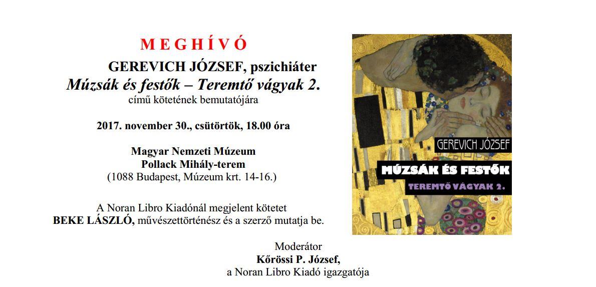 GEREVICH JÓZSEF, pszichiáter Múzsák és festők – Teremtő vágyak 2. című kötetének bemutatója a Magyar Nemzeti Múzeum Dísztermében kerül megrendezésre.