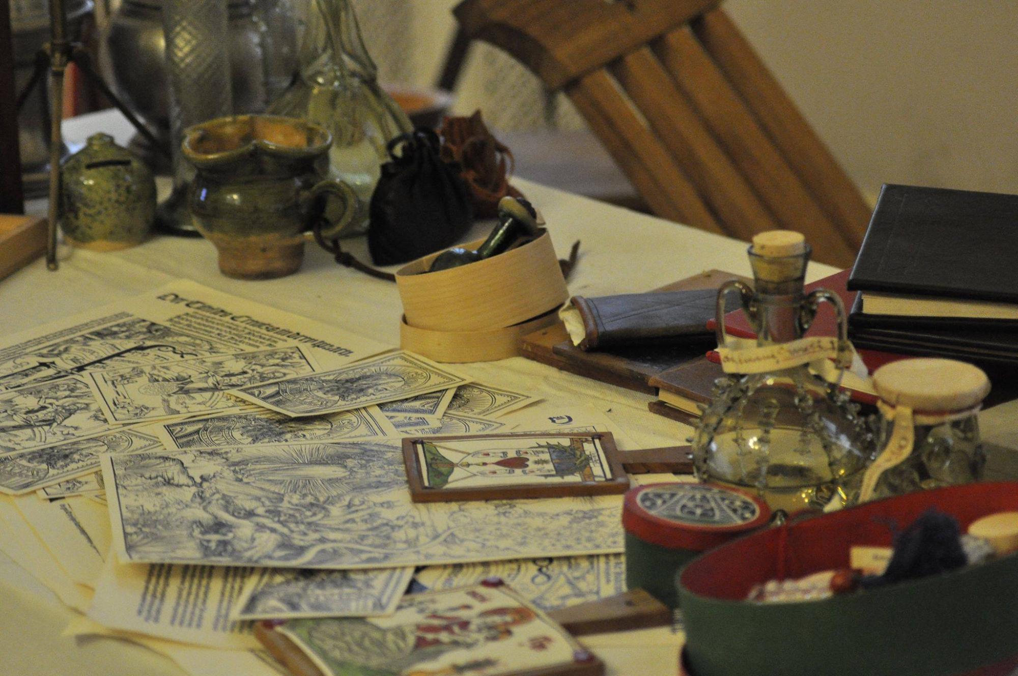 XV. századi életmód bemutató (Fűszerkereskedő, seborvos, bába, gabonakereskedő, késes, érme, fegyver, páncél) - Mathias Rex (Lépcsőház)