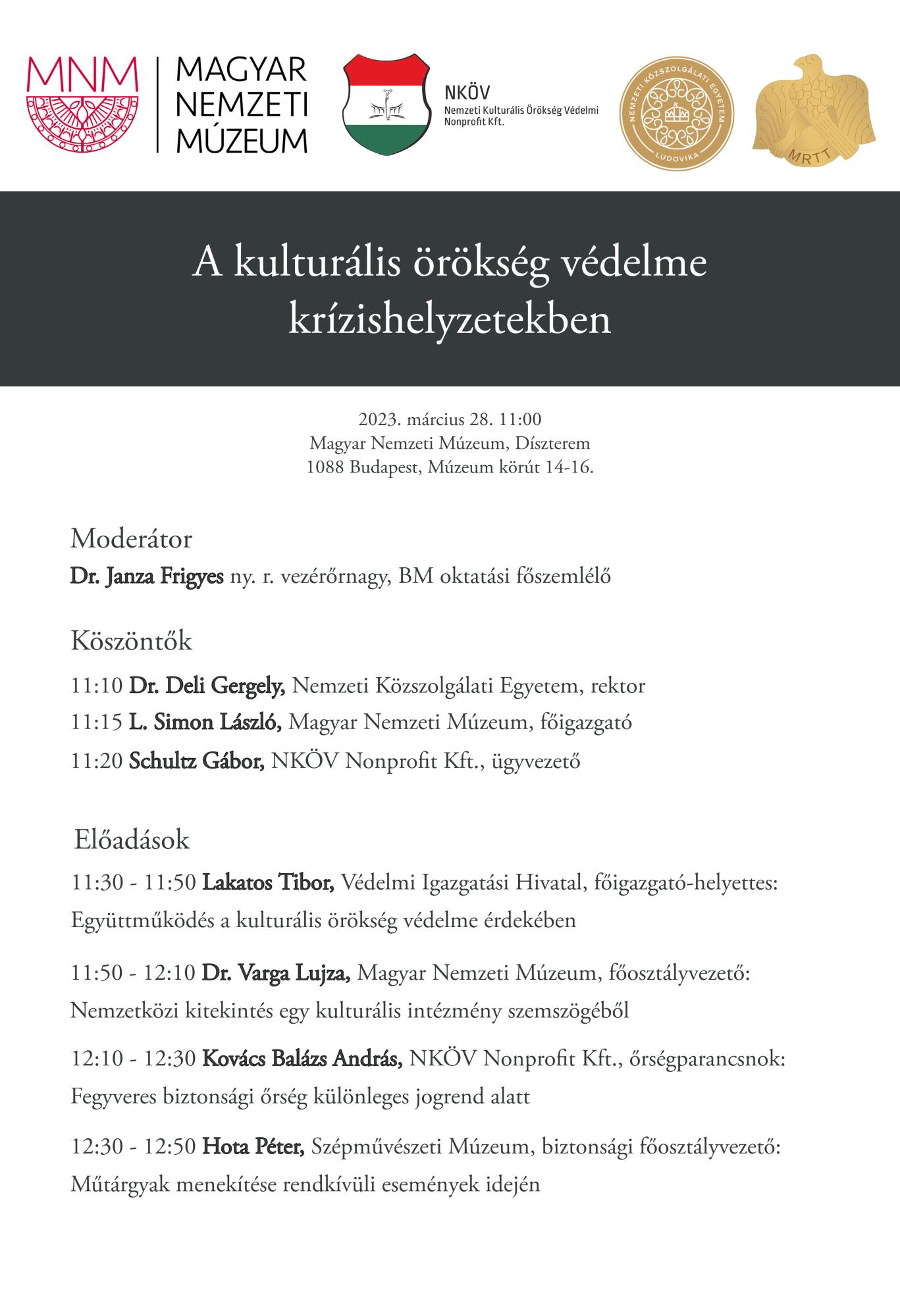 A Magyar Nemzeti Múzeum, a Nemzeti Közszolgálati Egyetem és az NKÖV Nonprofit Kft. 2023. március 28-án (kedden) közös konferenciát rendez a Magyar Nemzeti Múzeum Dísztermében A kulturális örökség védelme krízishelyzetekben címmel.