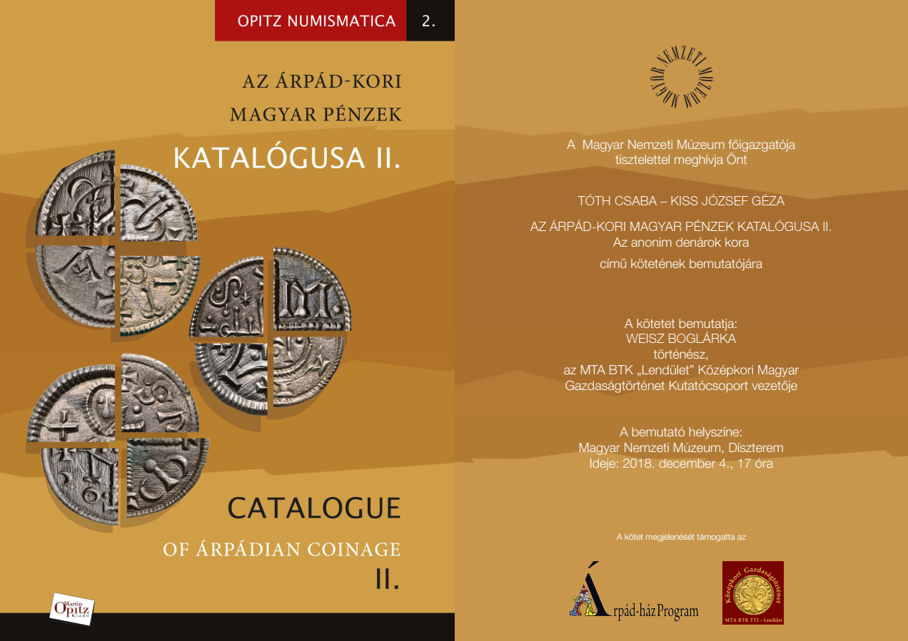 A Magyar Nemzeti Múzeum és a Martin Opitz Kiadó közös gondozásában, az Árpád-ház program támogatásával jelent meg Az Árpád-kori magyar pénzek katalógusának II. része. A Magyar Nemzeti Múzeum Éremtárának munkatársa, Tóth Csaba és szerzőtársa, a Szegedi Tudományegyetem kutatóprofesszora, Kiss József Géza legújabb kötete a 11–13. századi magyar pénzek eddigi legrészletesebb katalógusának második része, amely az anonim denárokat, azaz a konkrét kibocsátókhoz egyértelműen nem köthető 12–13. századi vereteket tartalmazza. A kétnyelvű, magyar–angol katalógus, amelynek bevezető tanulmánya szlovák nyelven is olvasható, több mint 900 méretarányos és nagyított színes éremfotón mutatja be a korszak 59 pénztípusát, illetve annak kétszáznál is több variációját, míg a korszakra jellemző ellenőrzőjegyek, más néven sziglák változatainak sorát több mint 3500 rajz illusztrálja.