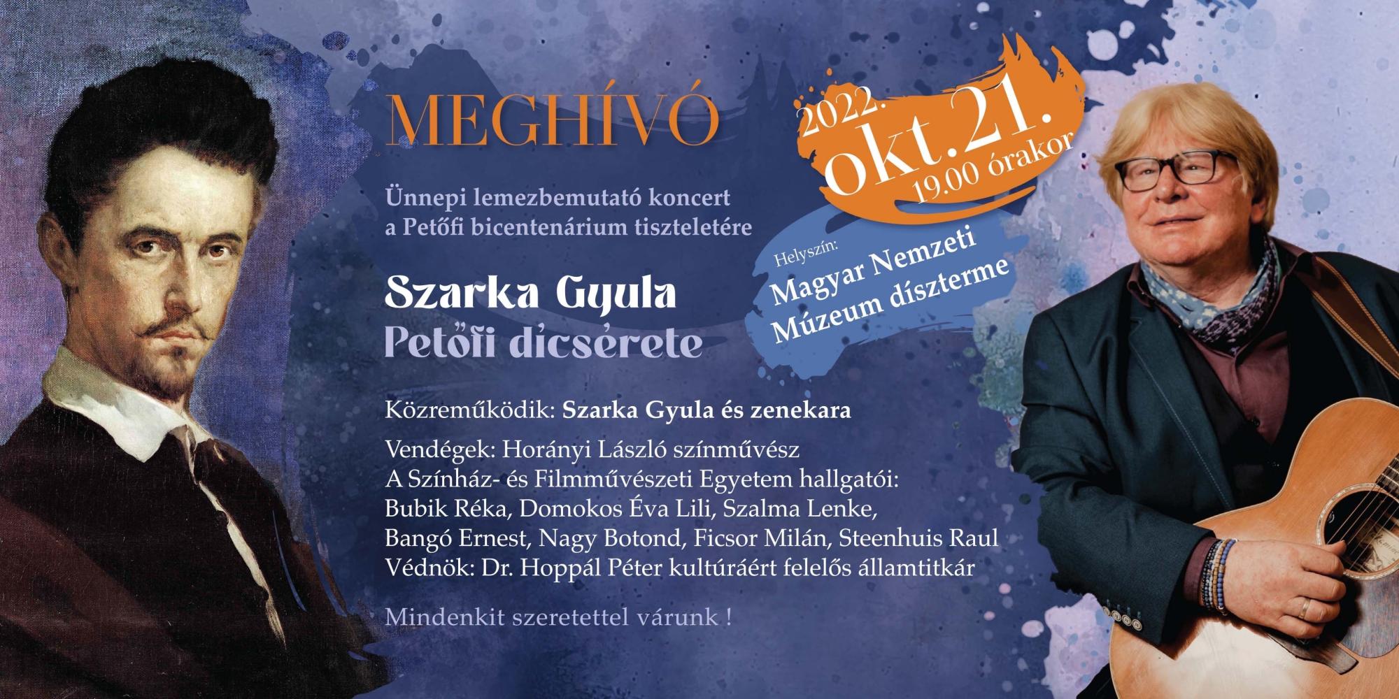 Szarka Gyula Kossuth-díjas énekes, gitáros, zeneszerző, a Ghymes együttes alapító tagjának különleges koncertje a Magyar Nemzeti Múzeumban Petőfi Sándor születésének 200. évfordulójának apropójából.