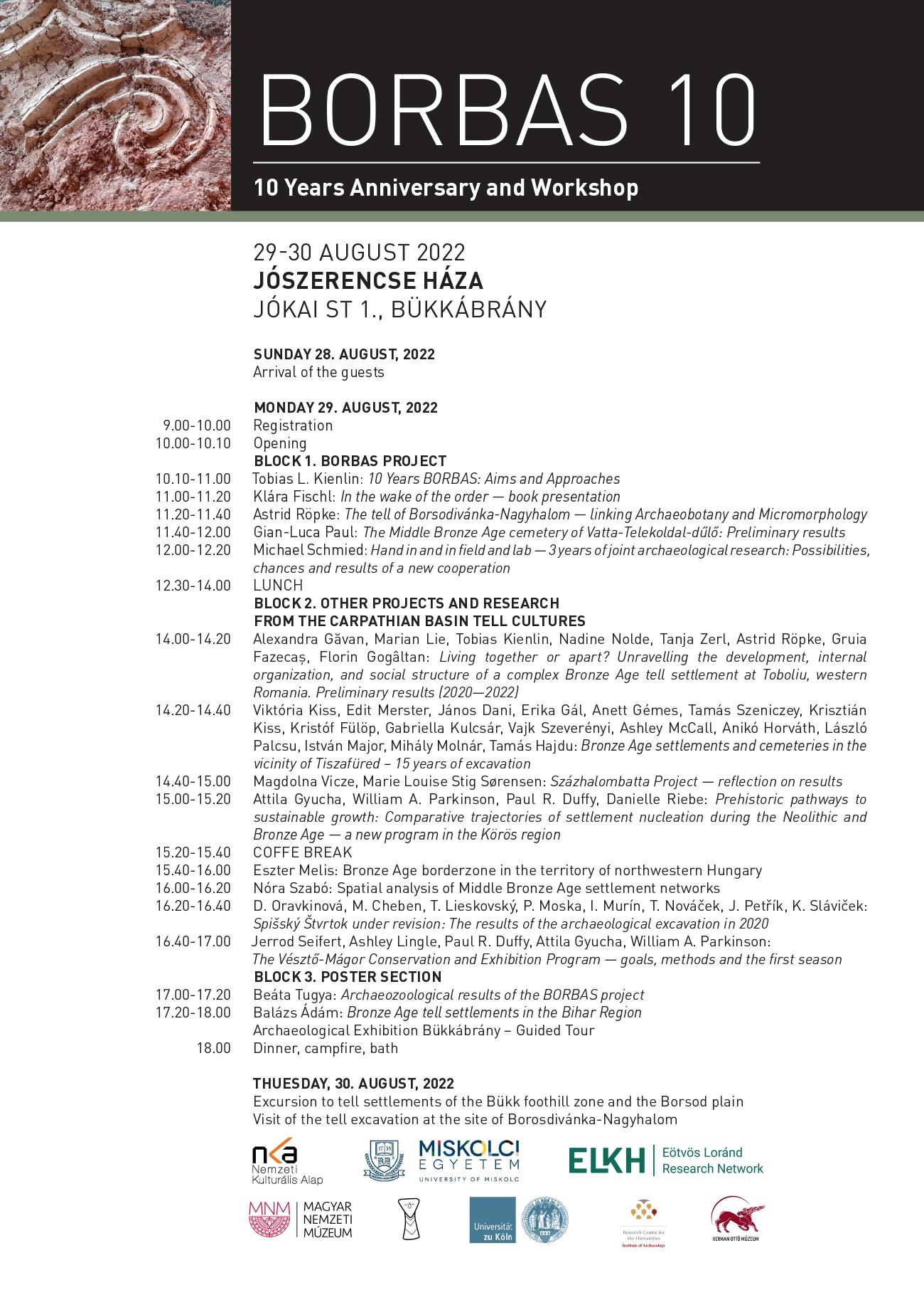 🔎A BORBAS projekt (Borsod Region Bronze Age Settlements) résztvevői 10 éve kutatják a Bükkalja és a Délborsodi-Mezőség 4000 évvel ezelőtti településtörténetét. A projekt vezetői Tobias Kienlin (Kölni Egyetem), Pusztai Tamás (MNM) és munkatársunk, Pusztainé dr. Fischl Klára (Miskolci Egyetem/BTK RI). Az évforduló alkalmából 2022. augusztus 29-30-án Bükkábrányban, a Jószerencse házában egy nemzetközi workshop keretében a bronzkori települési hálózatokat vizsgáló projektek legújabb eredményeivel ismerkedhetnek meg az érdeklődők. A tudományos üléssel egyidőben kerül sor A rend nyomában című kötet helyi bemutatójára és egy vándorkiállítás megnyitására.