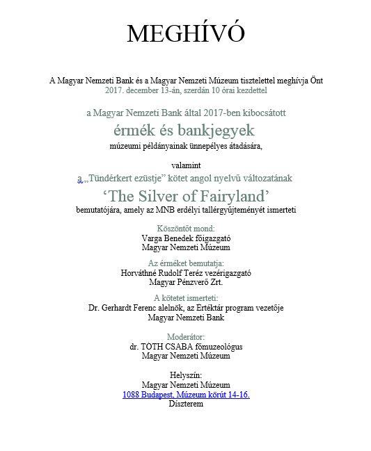Kettős eseménynek ad helyszínt a Magyar Nemzeti Múzeum díszterme 2017. december 13-án 10 órai kezdettel. Ekkor kerül sor a Magyar Nemzeti Bank által a 2017. évben kibocsátott érmék és bankjegyek múzeumi példányainak ünnepélyes átadására, majd ezt követően mutatjuk be a nyáron megjelent Tündérkert ezüstje című könyv angol nyelvű változatát.