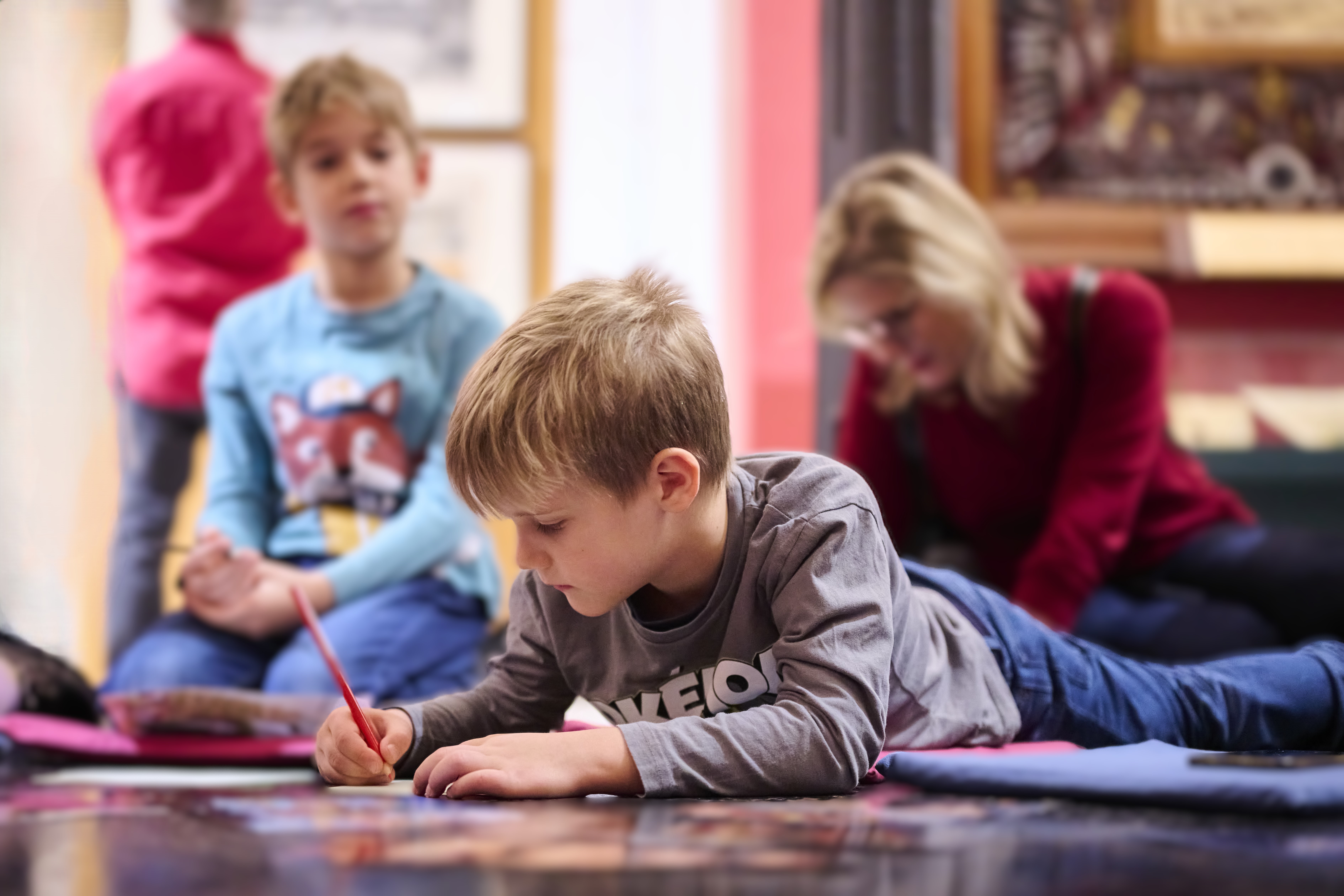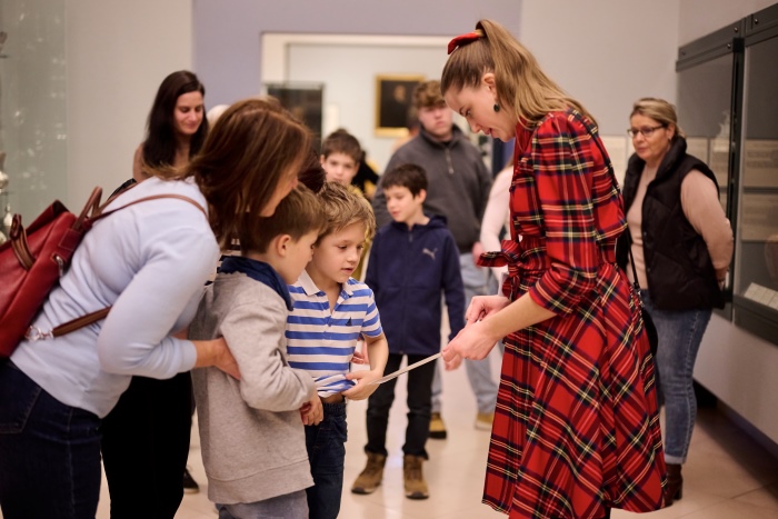 A program nem vezetett túra, a család játékos feladatokkal önállóan fedezi fel a kiállításokat.