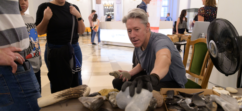 Dr. Lengyel György, a kőeszközök egyik hazai specialistája a pattintás rejtelmeibe vezeti be a látogatókat.