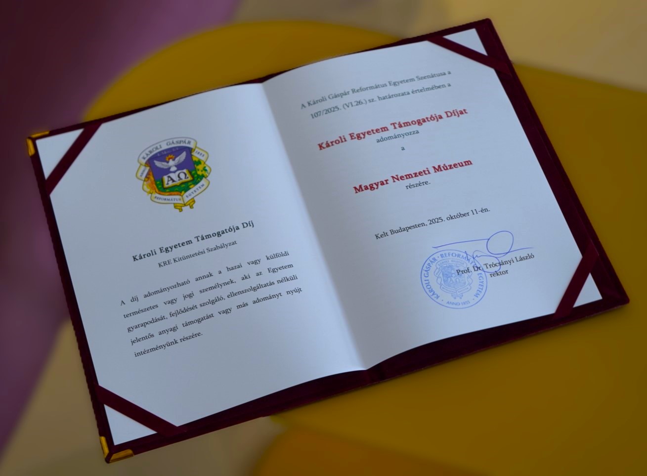 Nagy megtiszteltetés érte a Magyar Nemzeti Múzeumot: a Károli Gáspár Református Egyetem 2025. október 11-én   rendezte meg a Károli Egyetem Napját, mely során Károli Egyetem Támogatója Díjjal tüntették ki Intézményünket.