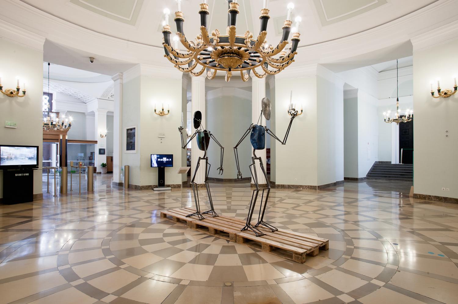 A kiállításon szereplő két figura, bár nem kinetikus, mégis mozgatható. Ez egy új és izgalmas irány, amikor a szobrot olyanná alakíthatjuk a csavarok meghúzásásval, amit a tér és a helyszín megkíván.