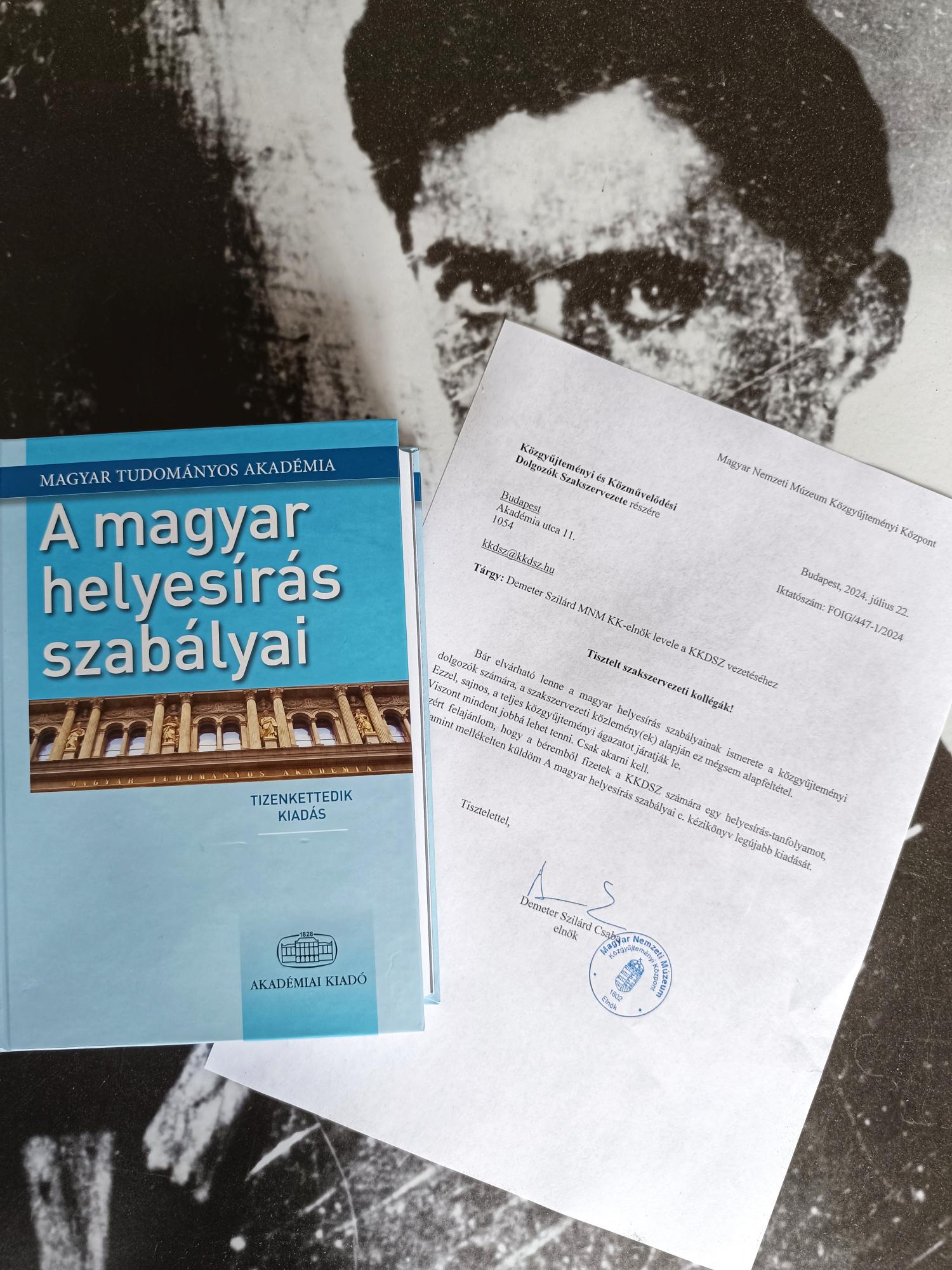 Ezért felajánlom, hogy a béremből fizetek a KKDSZ vezetői számára egy helyesírás-tanfolyamot, valamint mellékelten küldöm A magyar helyesírás szabályai c. kézikönyv legújabb kiadását.
