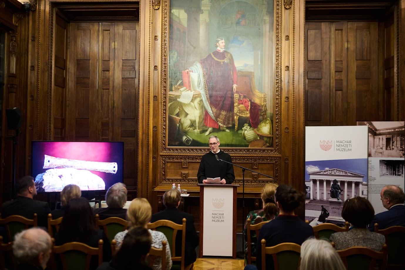 Dr. Ritoók Ágnes, a Magyar Nemzeti Múzeum régésze mutatta be a műtárgyat. Elmondta többek között, hogy a kísérőleletek és a betűtípusok alapján valószínűsíthető, hogy a szenteltvíz-hintő 11. századi keletkezés. Az aspergillumról megállapították, hogy az eszköz alapanyaga egy kiskérődző, feltehetőleg juh lábszárcsontja.