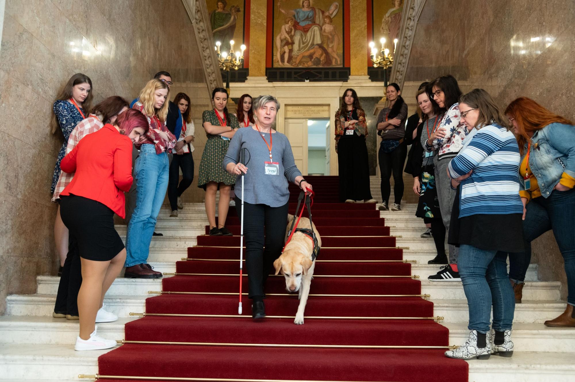 A workshopon velünk volt Borsodi Erzsébet és vakvezető kutyája, Gesztenye is, akik Farkasné dr. Gönczi Ritával, az NSZI Fogyatékosságügyi Igazgatóságának vezetőjével, közösen arra hívták fel a figyelmünket, mennyire fontos a kommunikáció szerepe a látássérültek, vak személyek világában. A résztvevőknek nem csak a workshop irányított feladatai, de a szünetek során is volt lehetősége gyakorolni a látó vezető technikát Erzsivel, aki maga ajánlotta fel ezt a lehetőséget számukra.