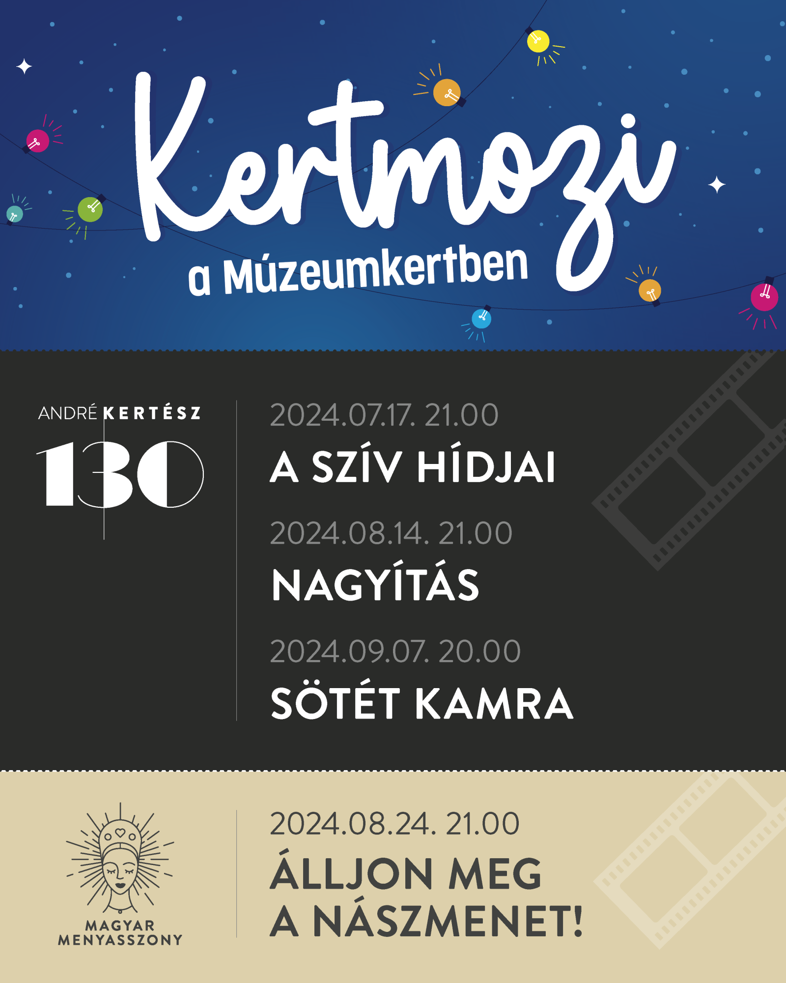 Útjára indult nyári kertmozi-sorozatunk, amelynek keretein belül a meleg nyári estéken júliustól szeptemberig a Kertész/Kópiák (André Kertész 130), és a Magyar Menyasszony időszaki kiállításokhoz kapcsolódó filmklasszikusokat lehet megtekinteni magyar szinkronnal, angol felirattal a Magyar Nemzeti Múzeum kertjében.