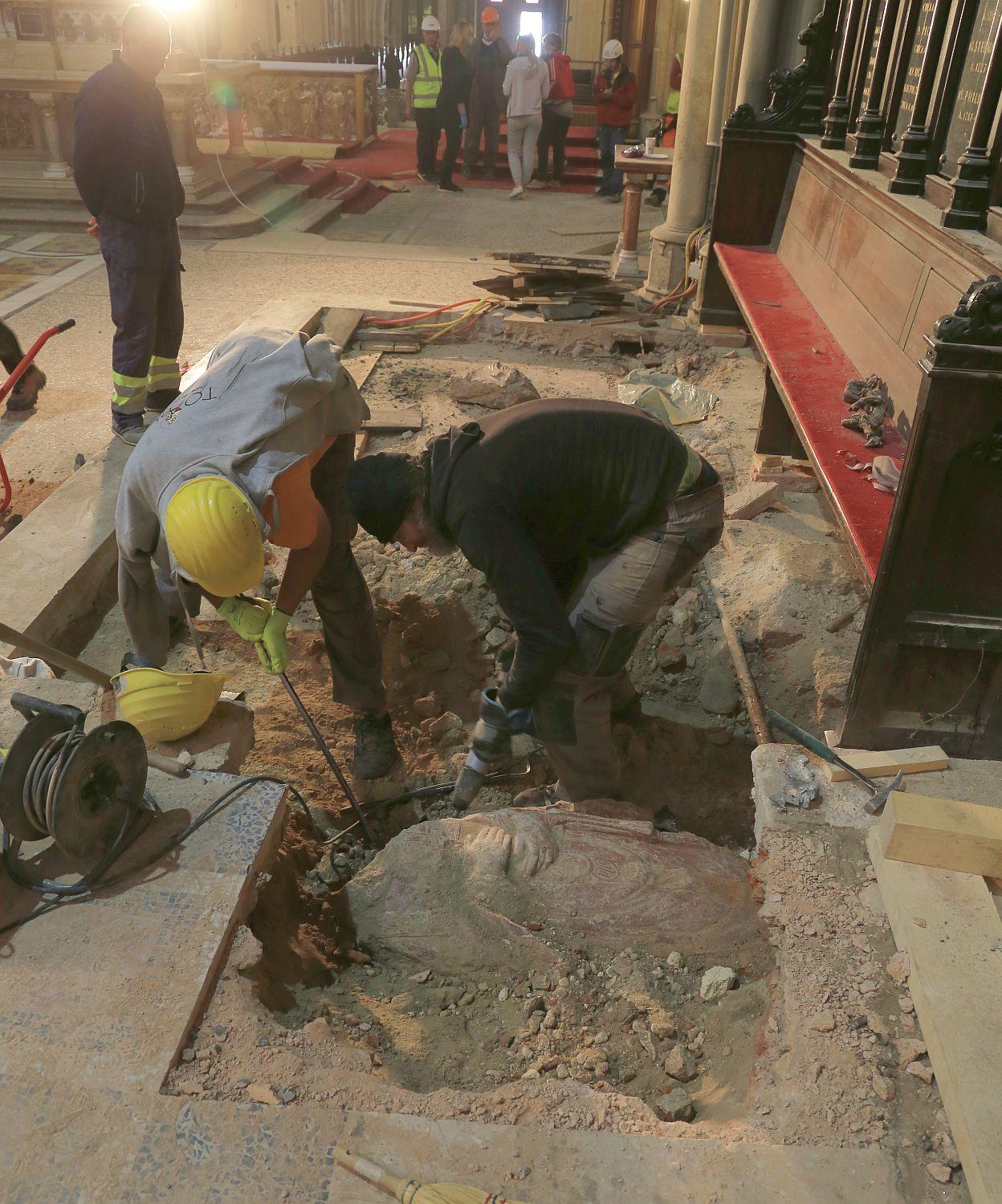 A sírkő újonnan felfedezett töredékének kiemelése a zágrábi székesegyház szentélyének padlója alól 2020. április 29-én