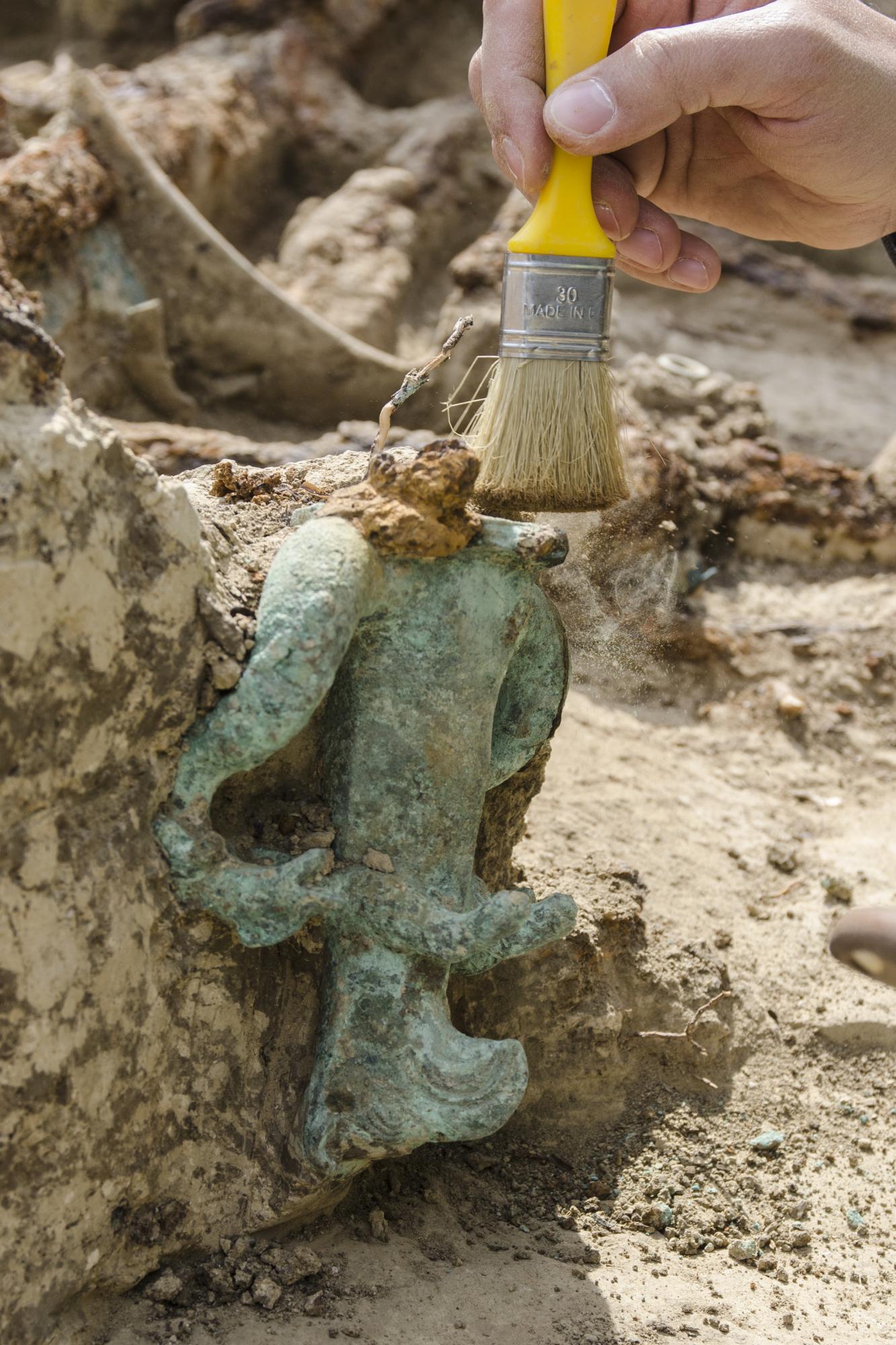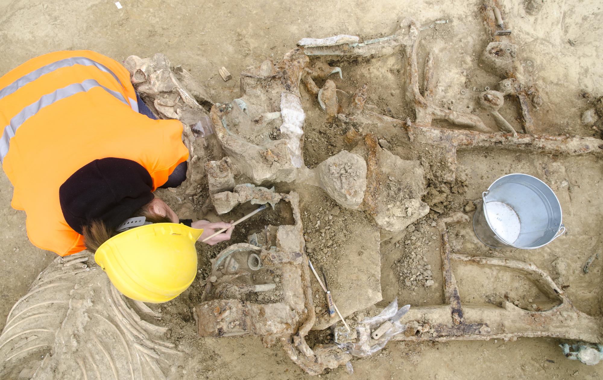 Benne a római kori utazókocsi vasalkatrészeivel, bronzdíszítményivel és a leölt két fogatos ló csontvázával